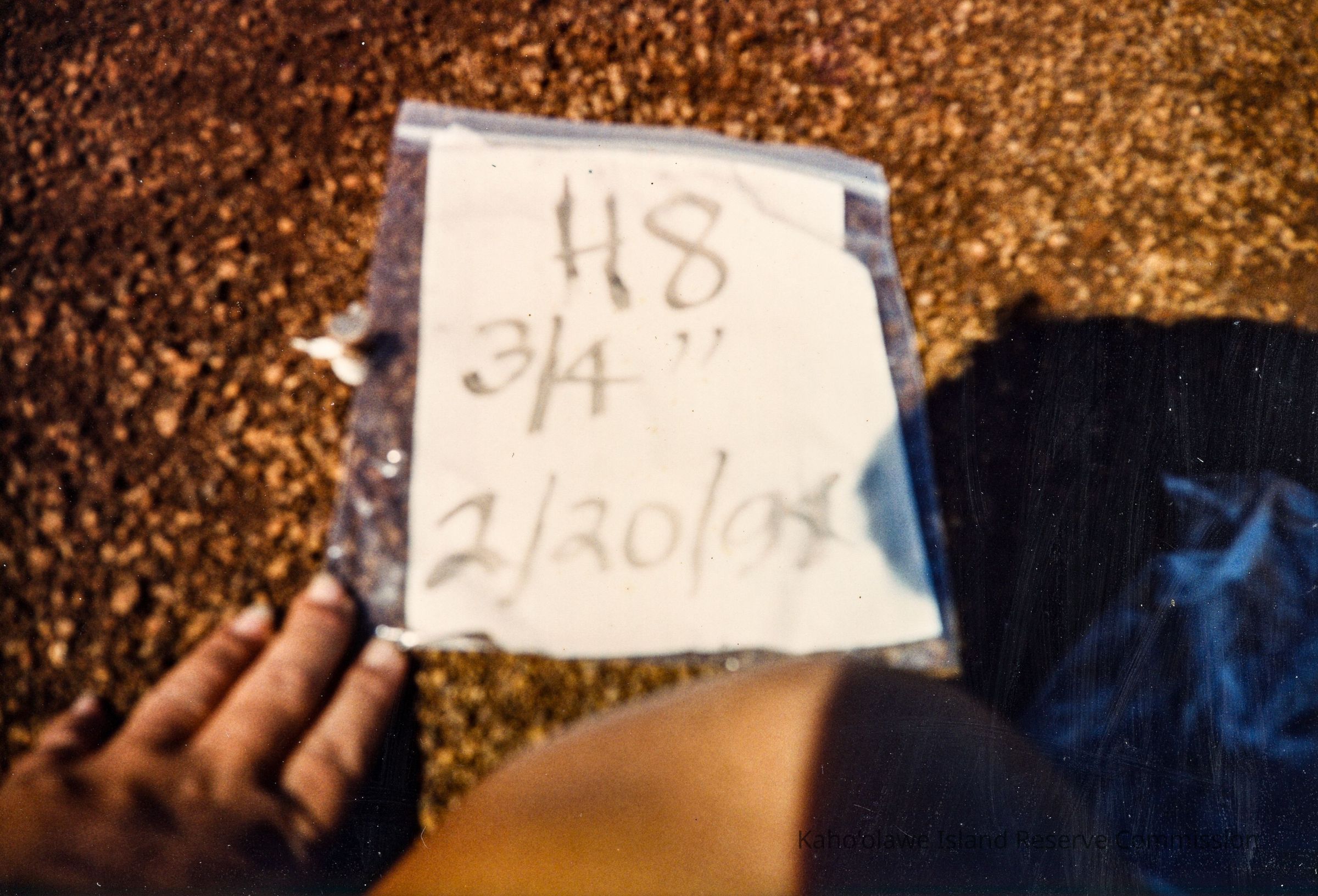 A hand is holding a plastic-covered sign showing measurements and a date, with an earthy background visible.
