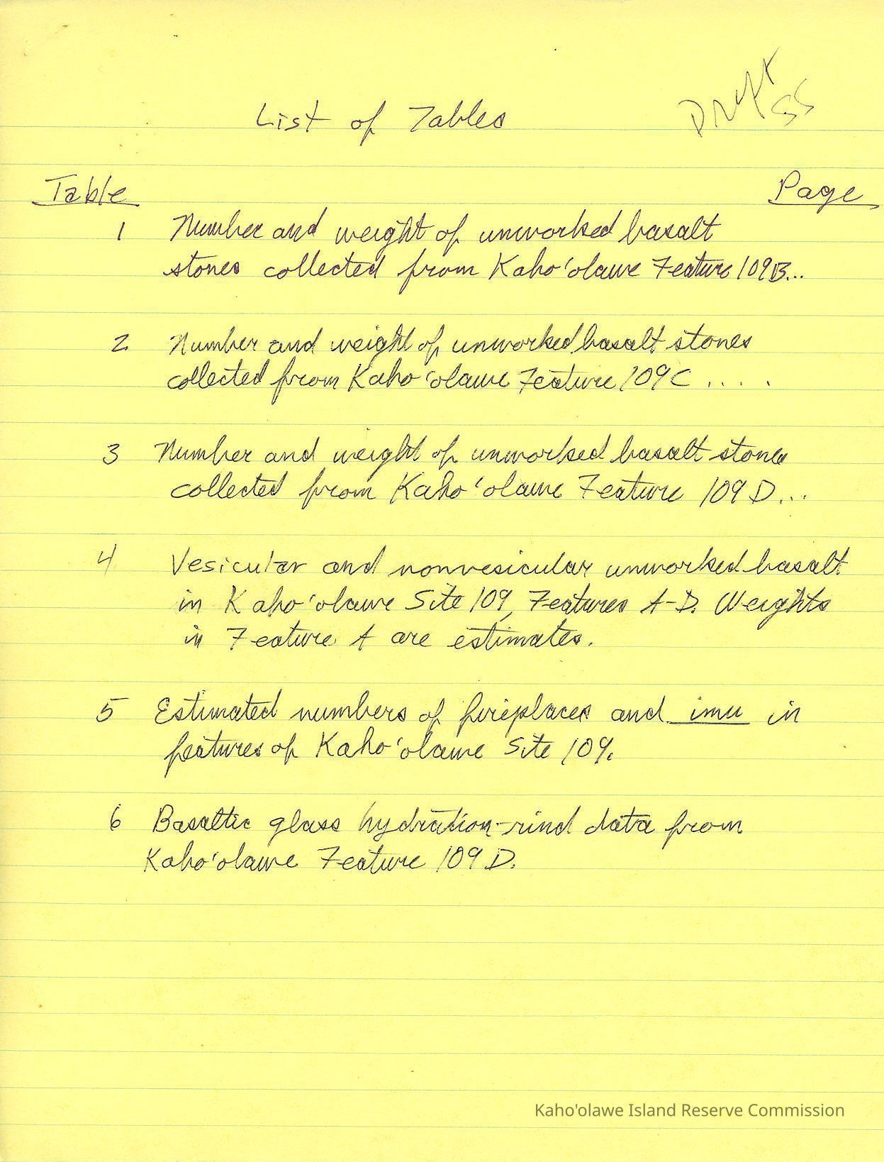 Handwritten list of tables, figures and description of figures for report on efforts regarding salvaging Site 109. Five handwritten yellow lined pages.Creator