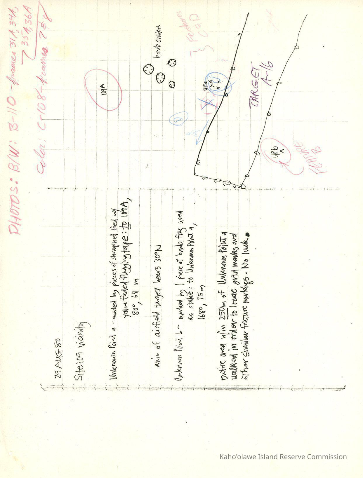 Copy of hand-written notes dated 19 Aug 1980 about Site 109 vicinity; hand-drawn diagram on yellow sheet and a copy of hand-written notes on a notebook page regarding Site 109. 1 yellow-line sheet, 2 repographic black and white copied 8.5" x 11" pages.Creator