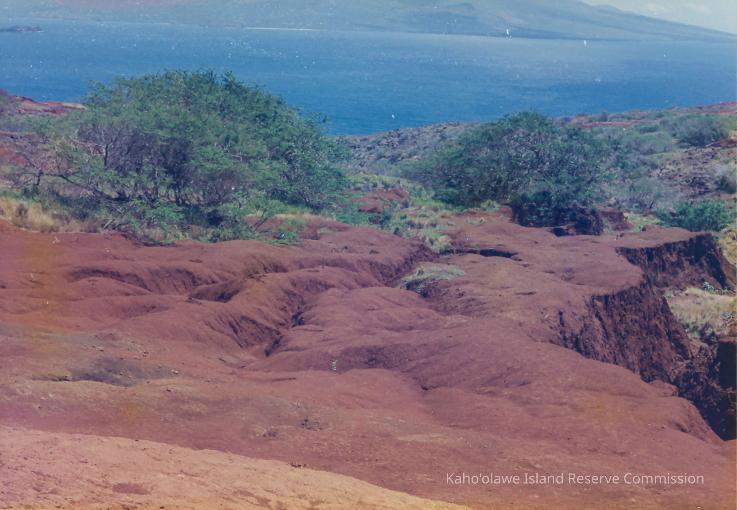 The image depicts hard pan and small seedlings and trees, overlooking a calm blue ocean under a clear sky. The island of Maui is in the background.