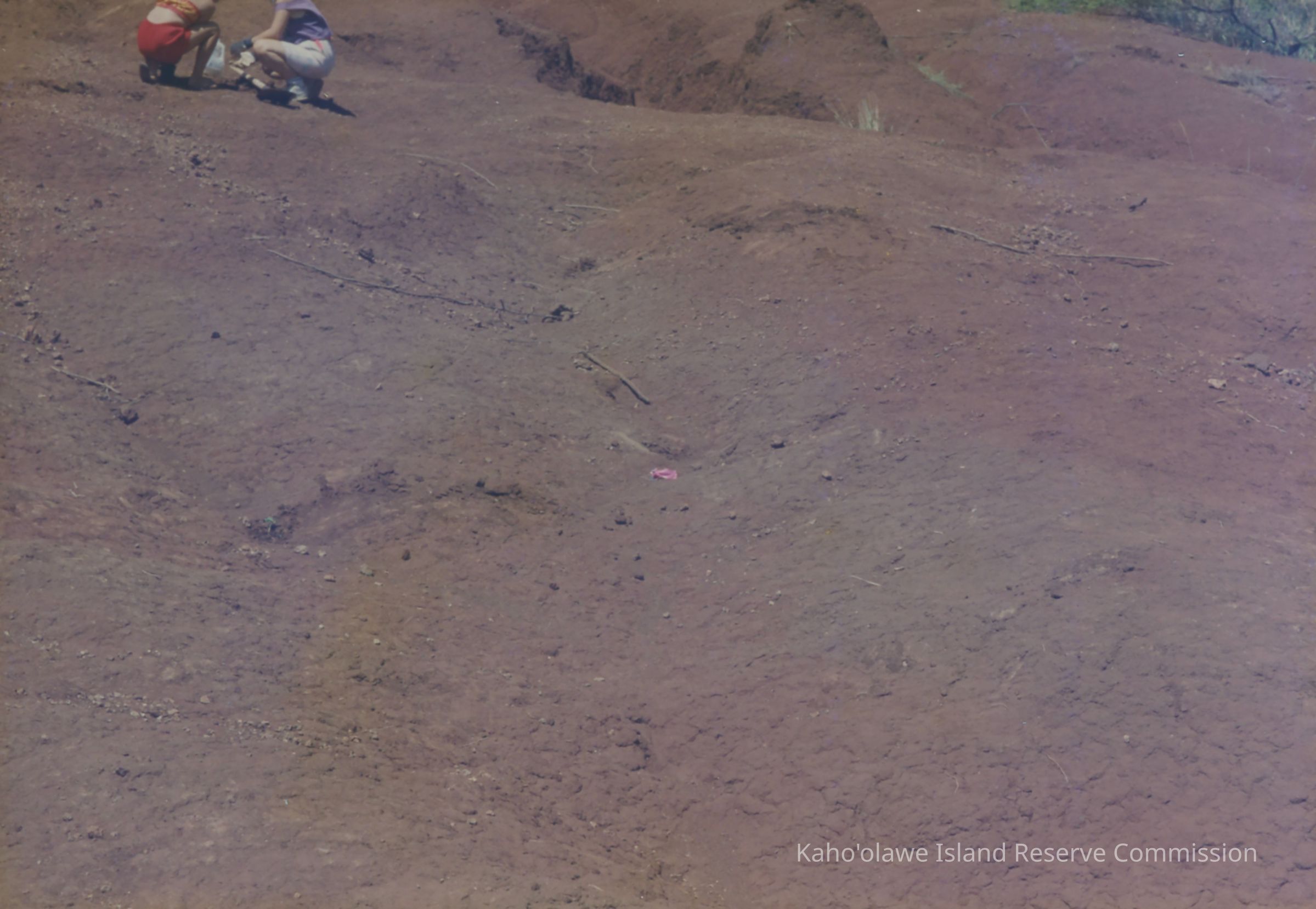 Color photo of a hard pan area with a red flag in the middle, indicating potential unexploded ordnance presence. Two people are in the background.Photograph Details