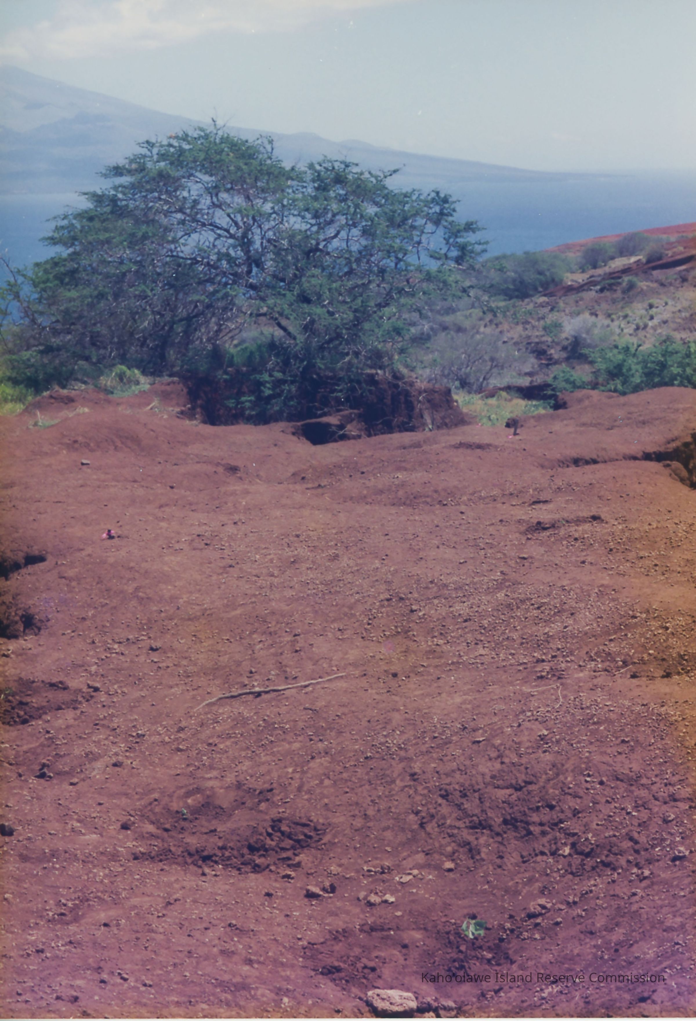 The image captures a rugged landscape with a solitary tree growing up from a gully against a backdrop of the island of Maui and a clear blue sea.
