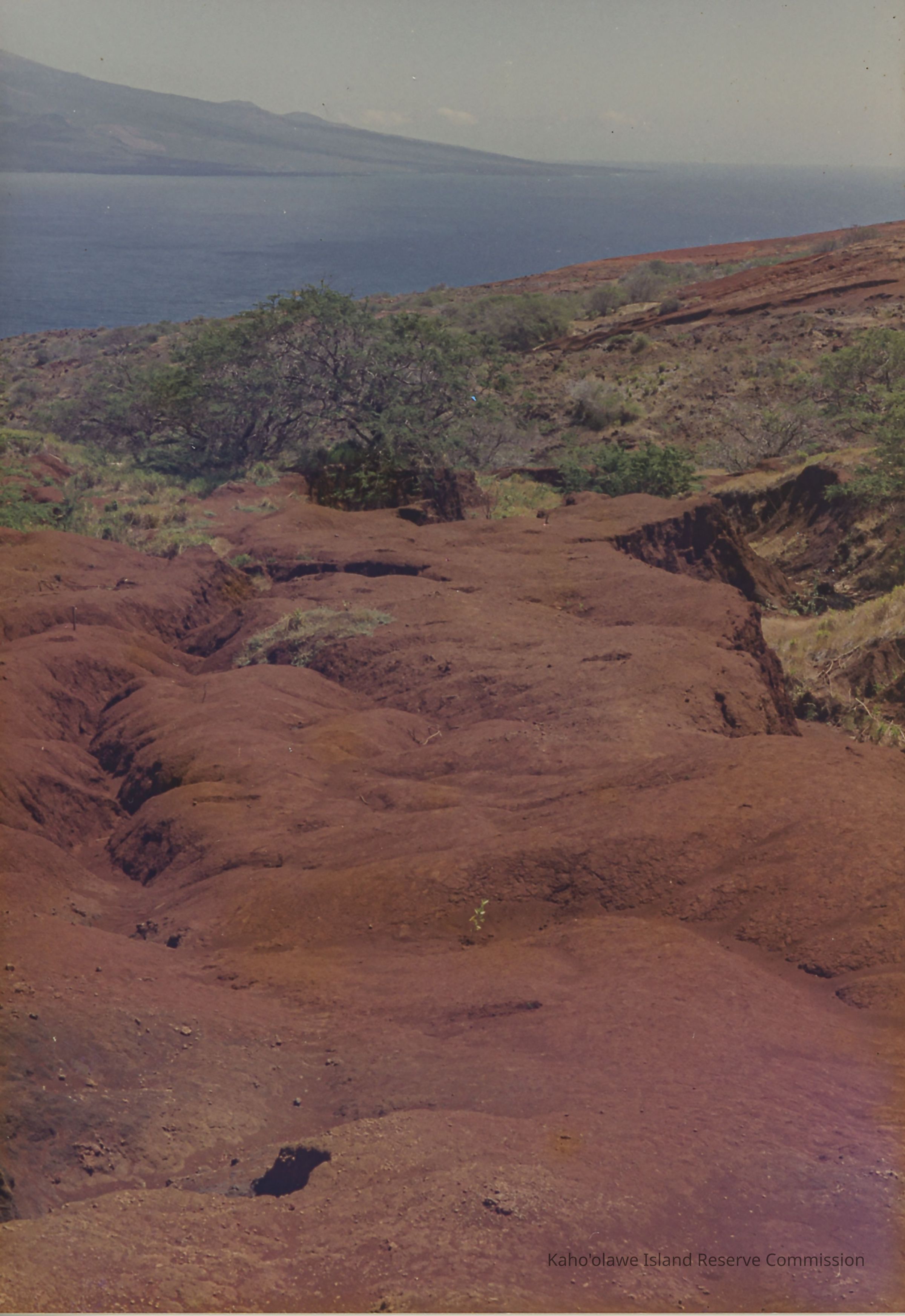 The image depicts a striking red earth landscape foreground with some seedlings planted on it and blue ocean in the background.