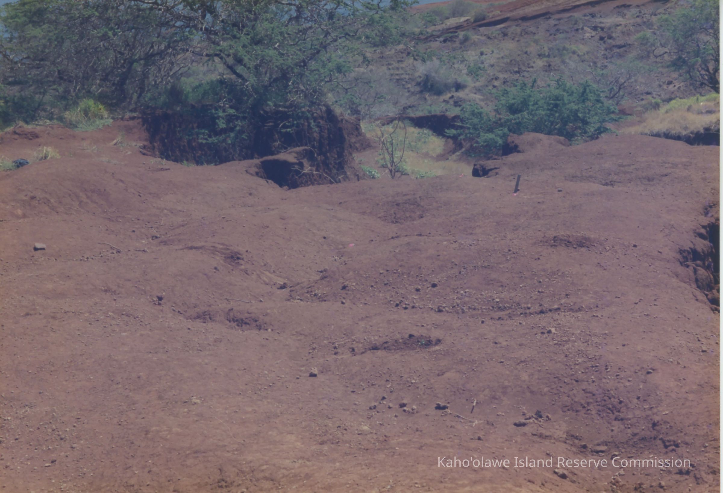 The image shows a barren, rocky hard pan landscape with sparse vegetation under a clear sky.