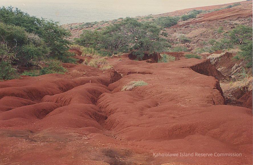 Color photo of hardpan gullies with kiawe trees and the ocean in the background.