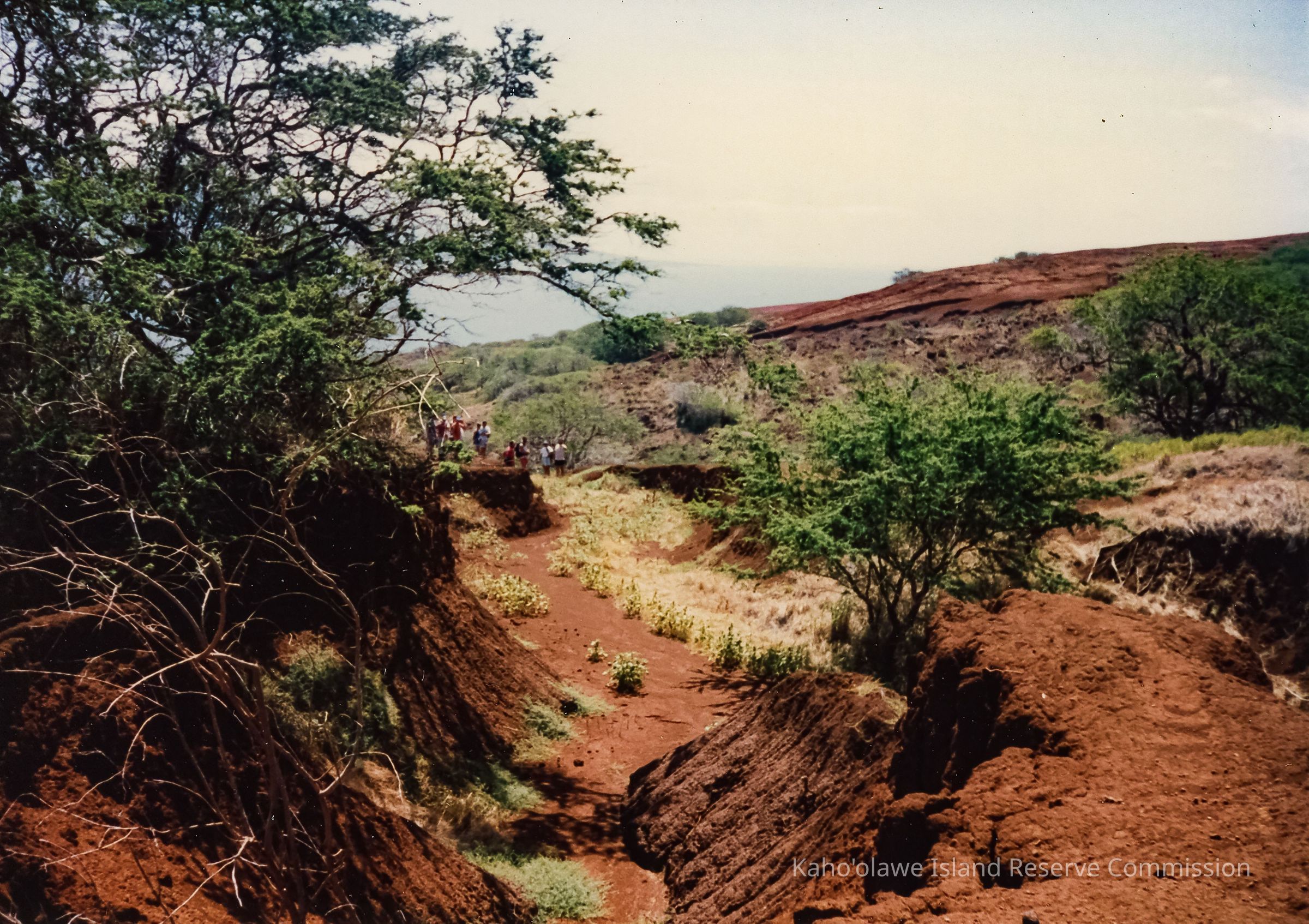 The image depicts a group of people hiking on a trail through a rugged landscape with red soil and sparse greenery, under a clear blue sky.