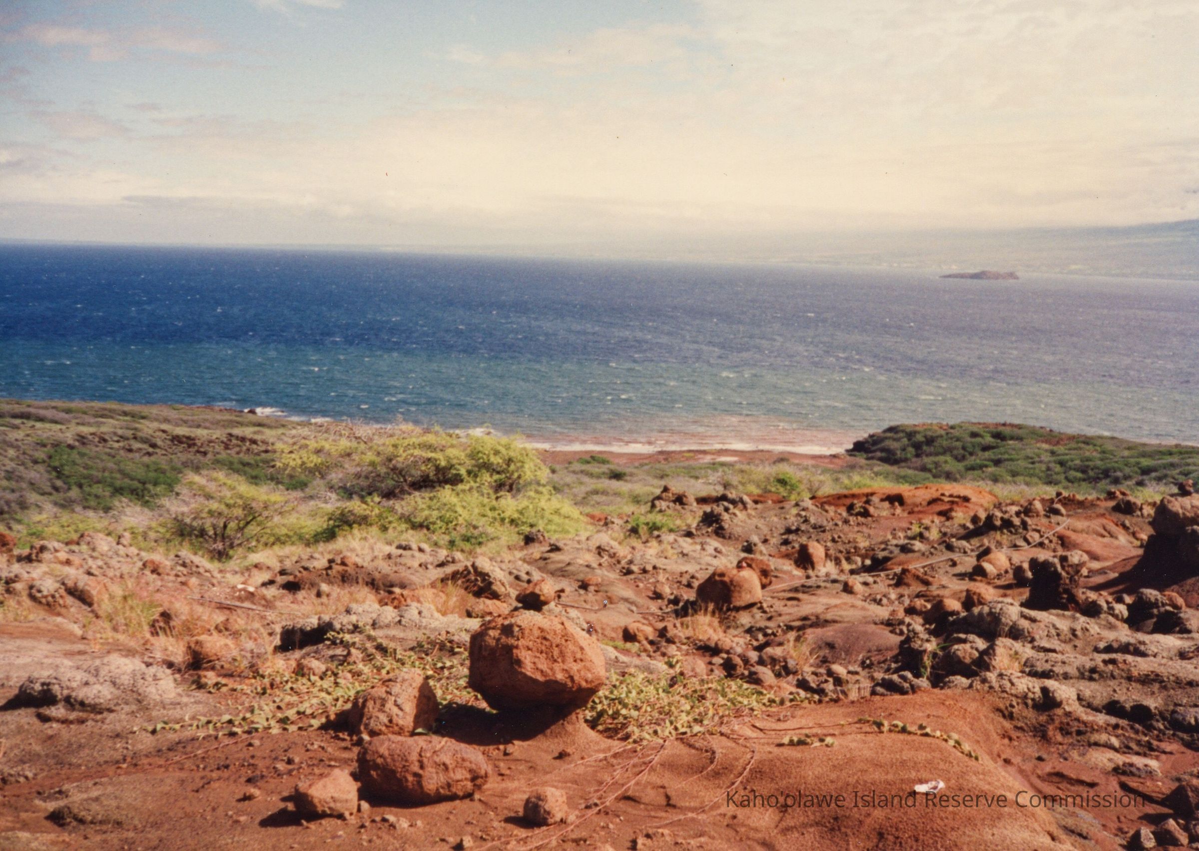 Color photograph of hardpan landscape with rocks and some shrubs and trees interspersed. The ocean and Molokini are in the background.