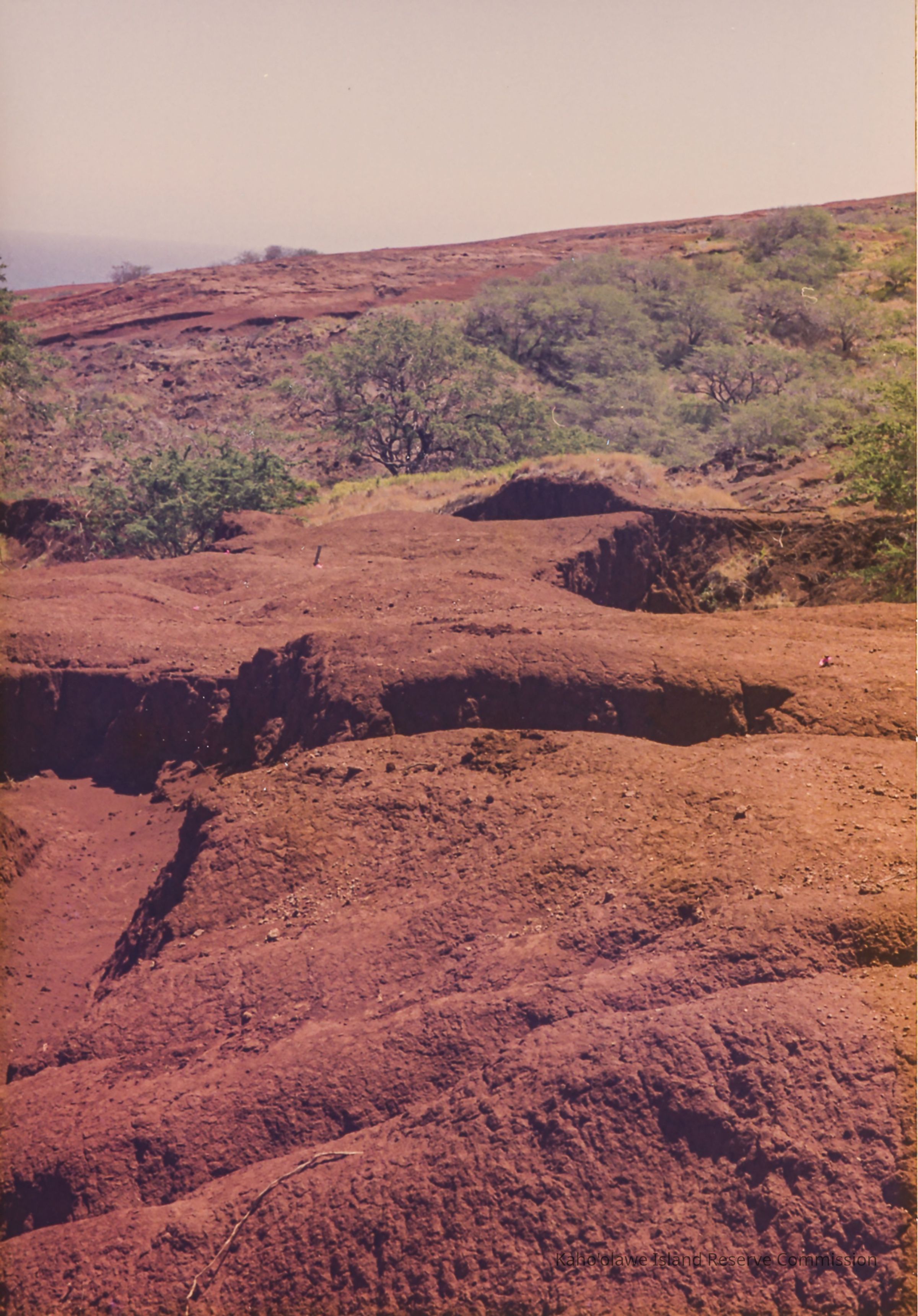 Color photo of hardpan landscape containing several narrow gulliesPhotograph Details