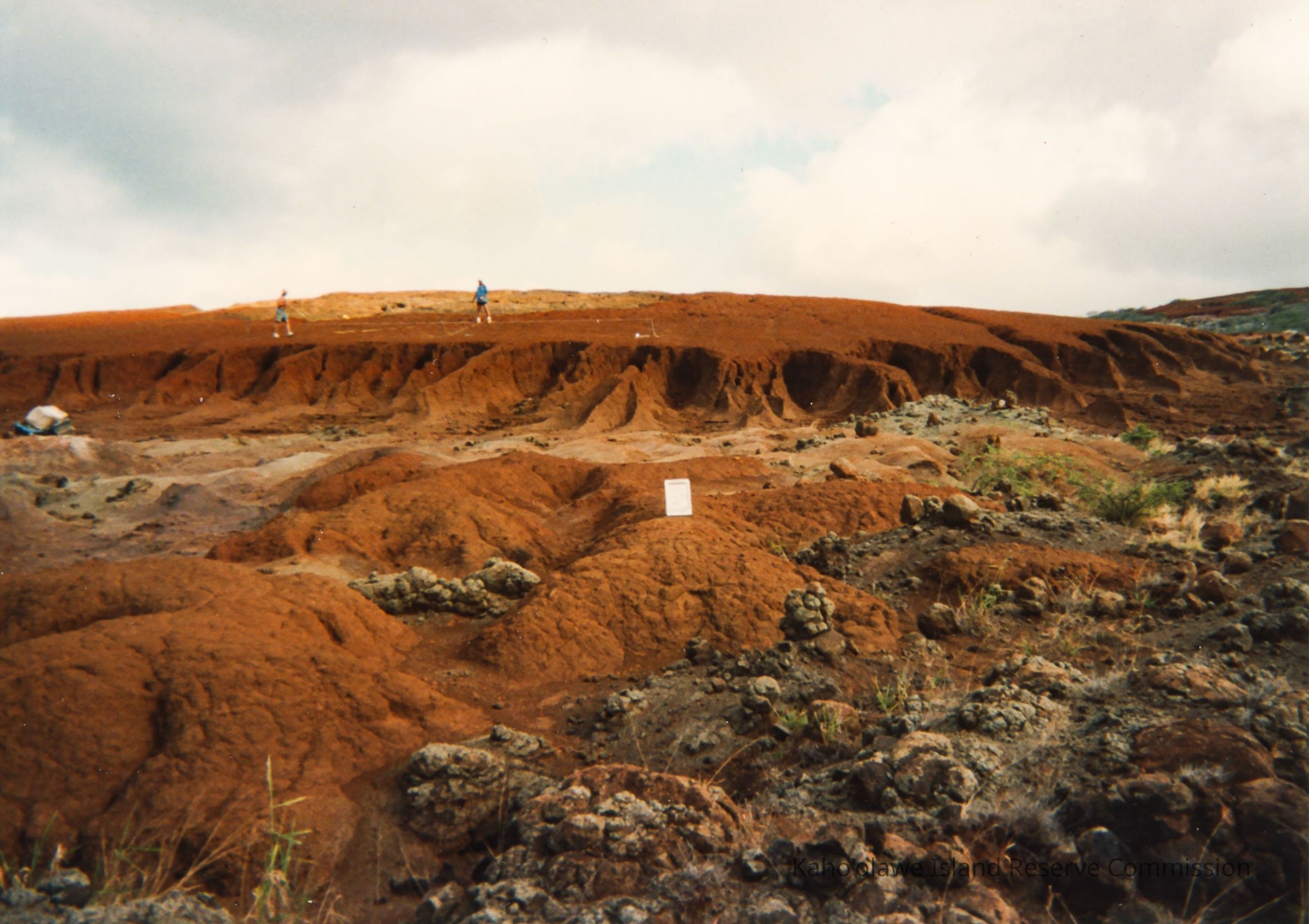 The image shows a rugged, orange-red landscape with deep erosion patterns, where two individuals are standing atop a hill.