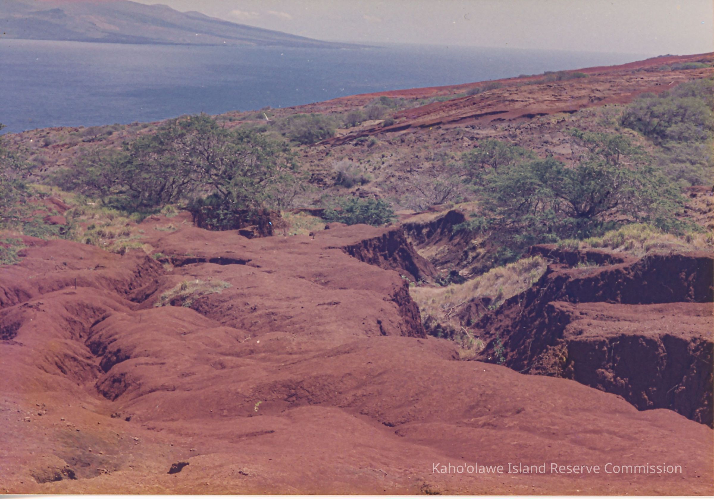Color photo of hardpan landscape with gullies, seedlings planted on surface. Trees growing up from gullies. Ocean is in the background.Photograph Details