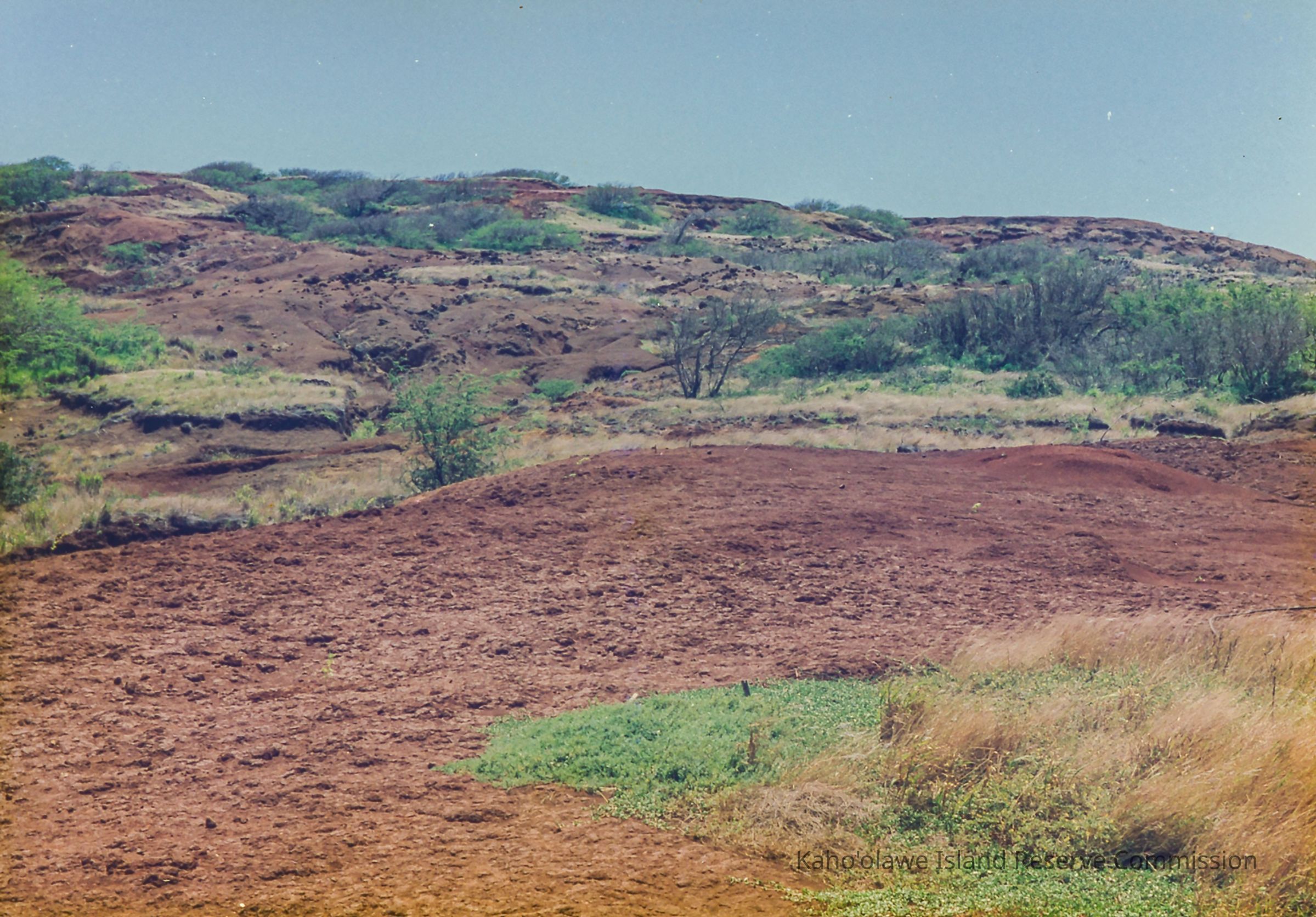 The image presents a rugged landscape with red-brown terrain and patches of green vegetation under a clear blue sky.