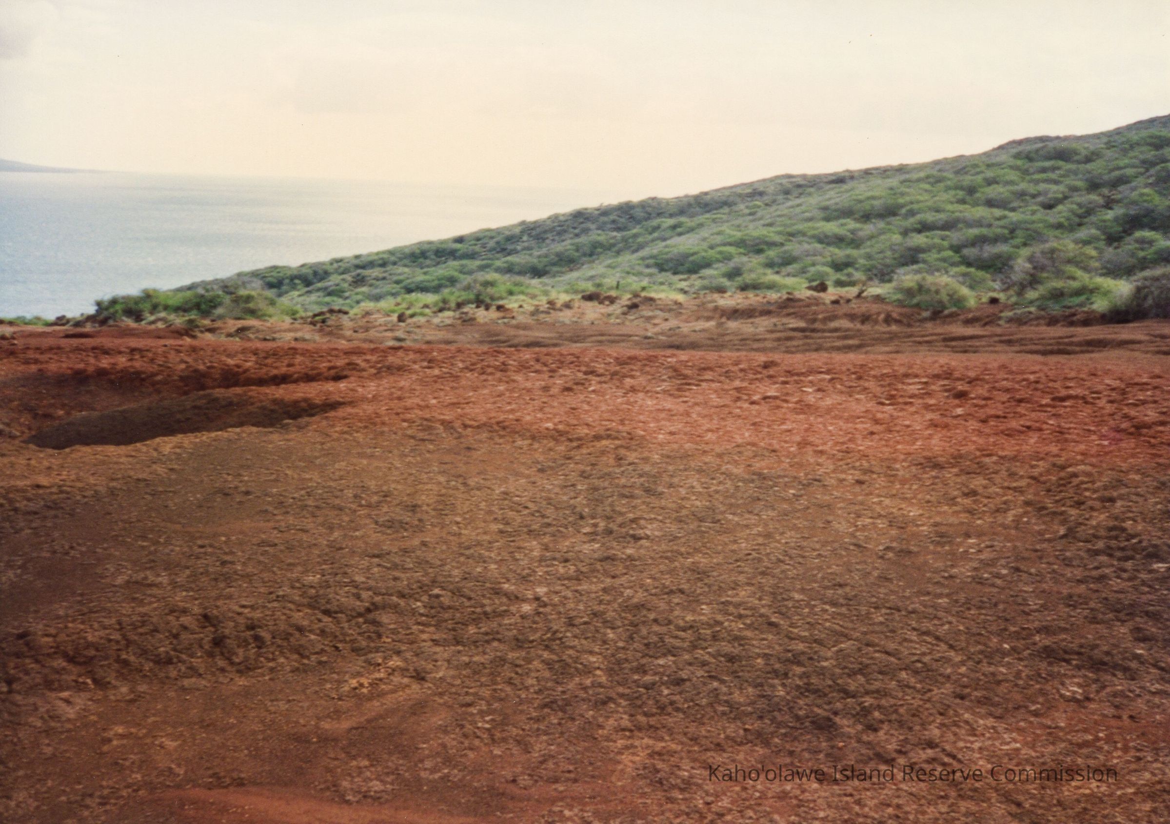 The image showcases a red, barren hardpan landscape with sparse vegetation, gently sloping toward a distant view of the ocean and green hills.
