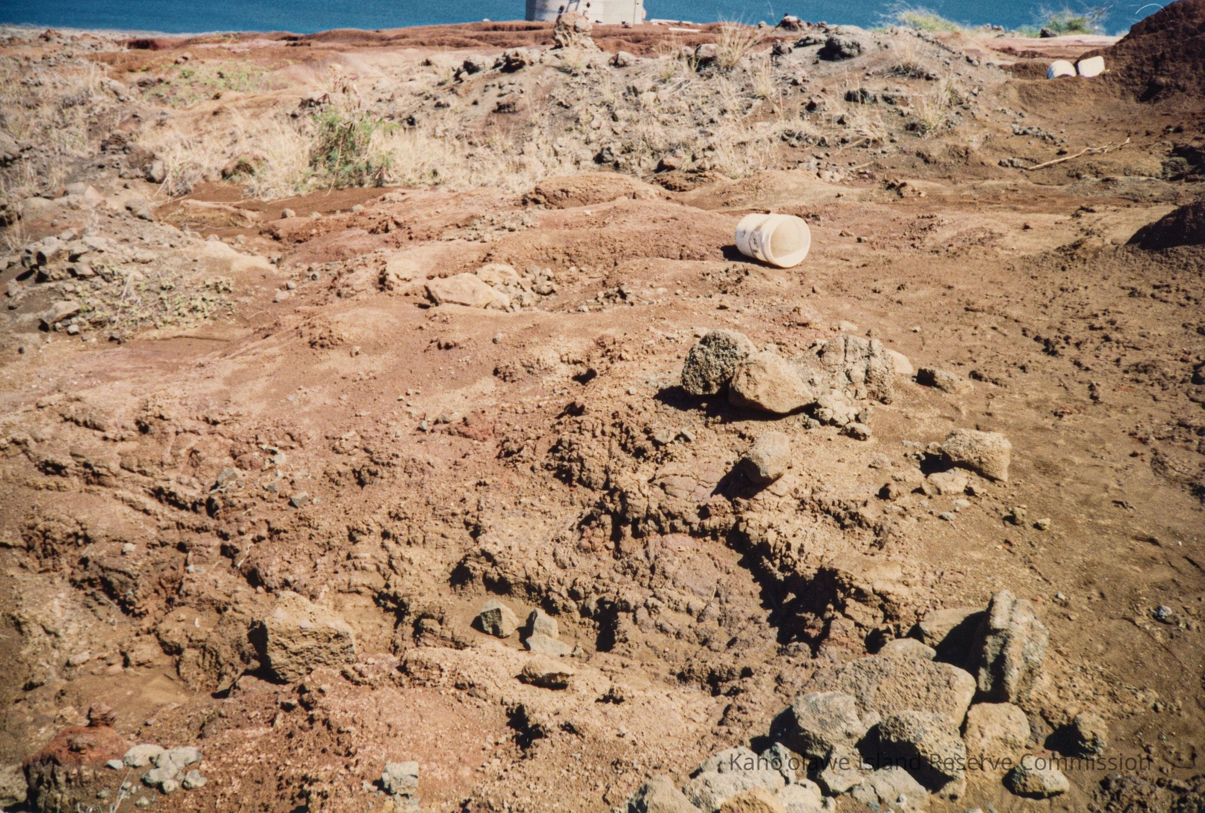 The image shows a barren landscape with hardpan soil, scattered rocks, sparse vegetation, and a plastic bucket lying on the ground.