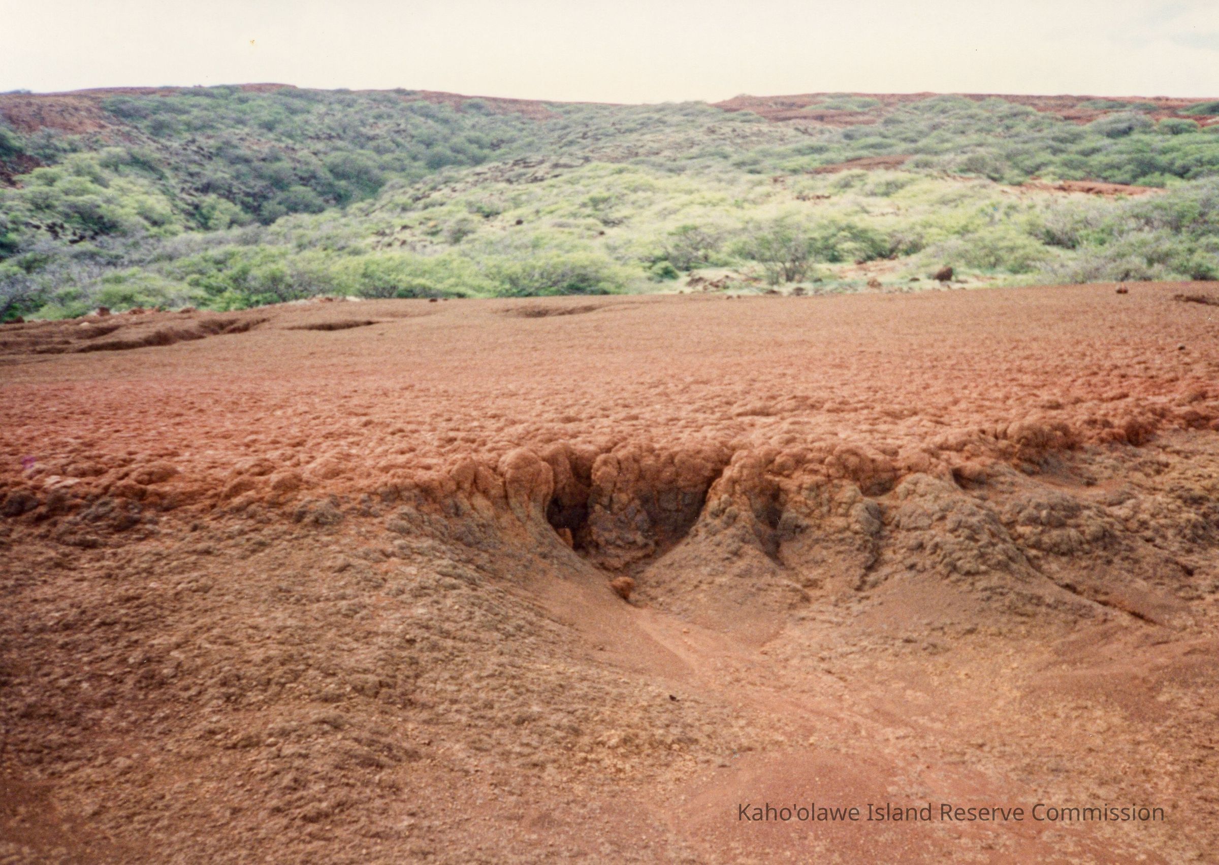 The image depicts a reddish-brown hardpan surface with visible erosion, surrounded by green shrub vegetation and hills in the background.