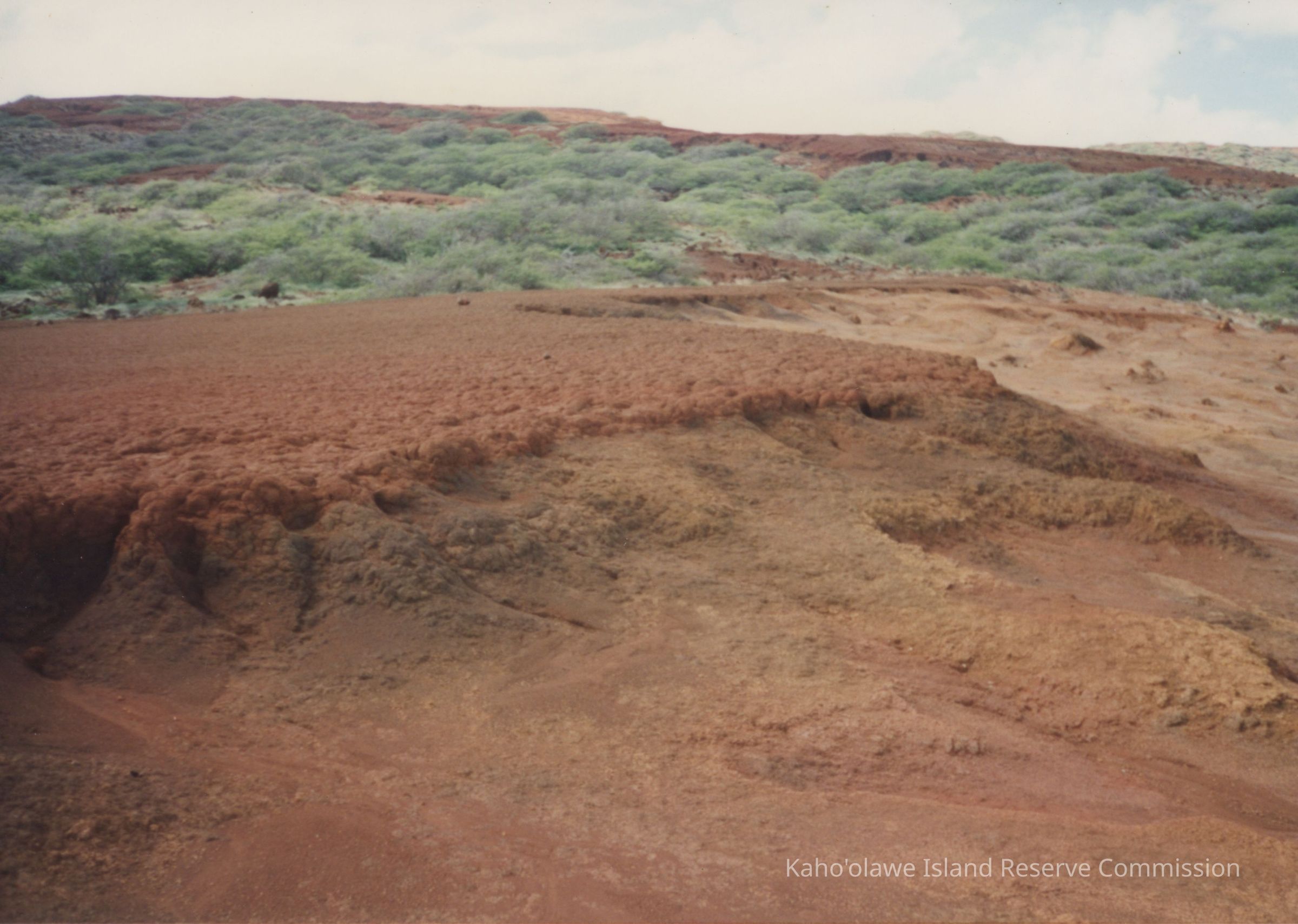 The image shows a rugged landscape with hardpan terrain in the foreground, characterized by its reddish-brown, cracked, and barren appearance. In the background.