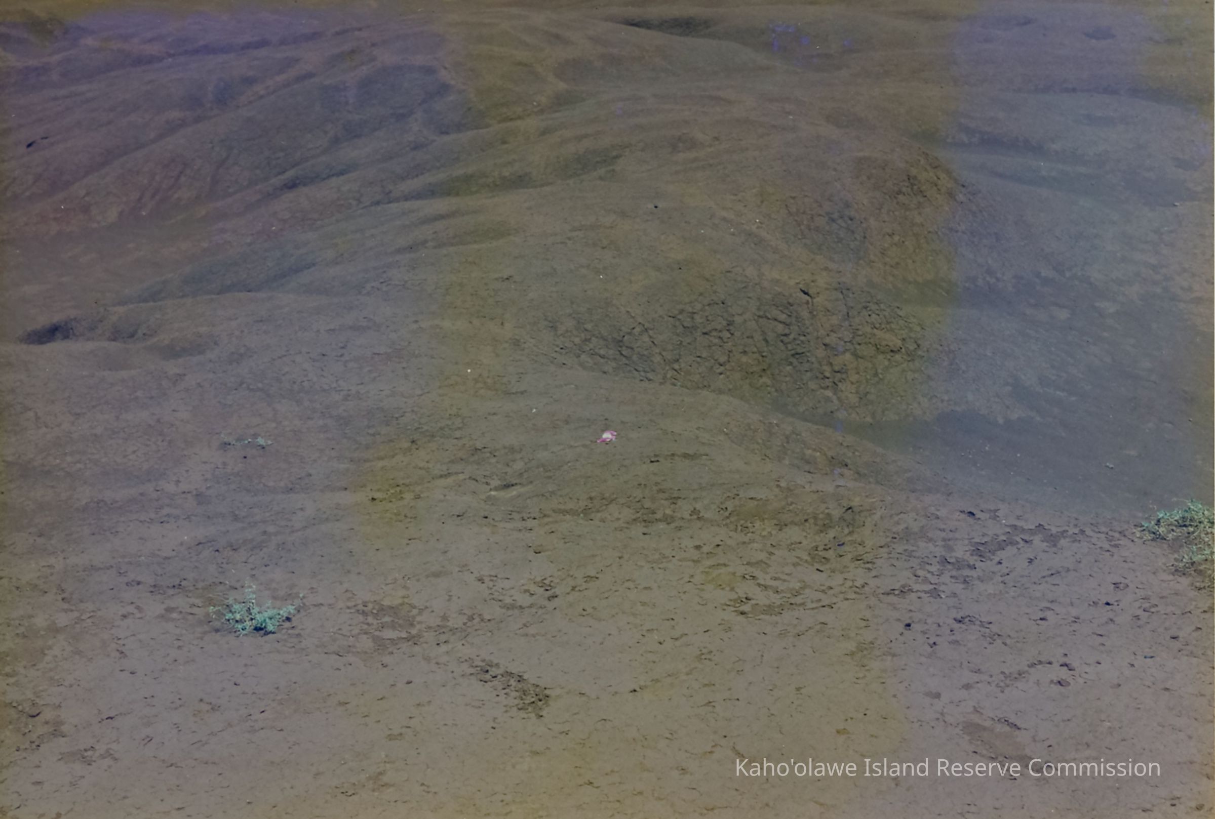 Color photo of hard pan terrain with a plant in the foreground and a red-flagged item in the middle. The red flag indicates potential unexploded ordnance (UXO) under the ground.