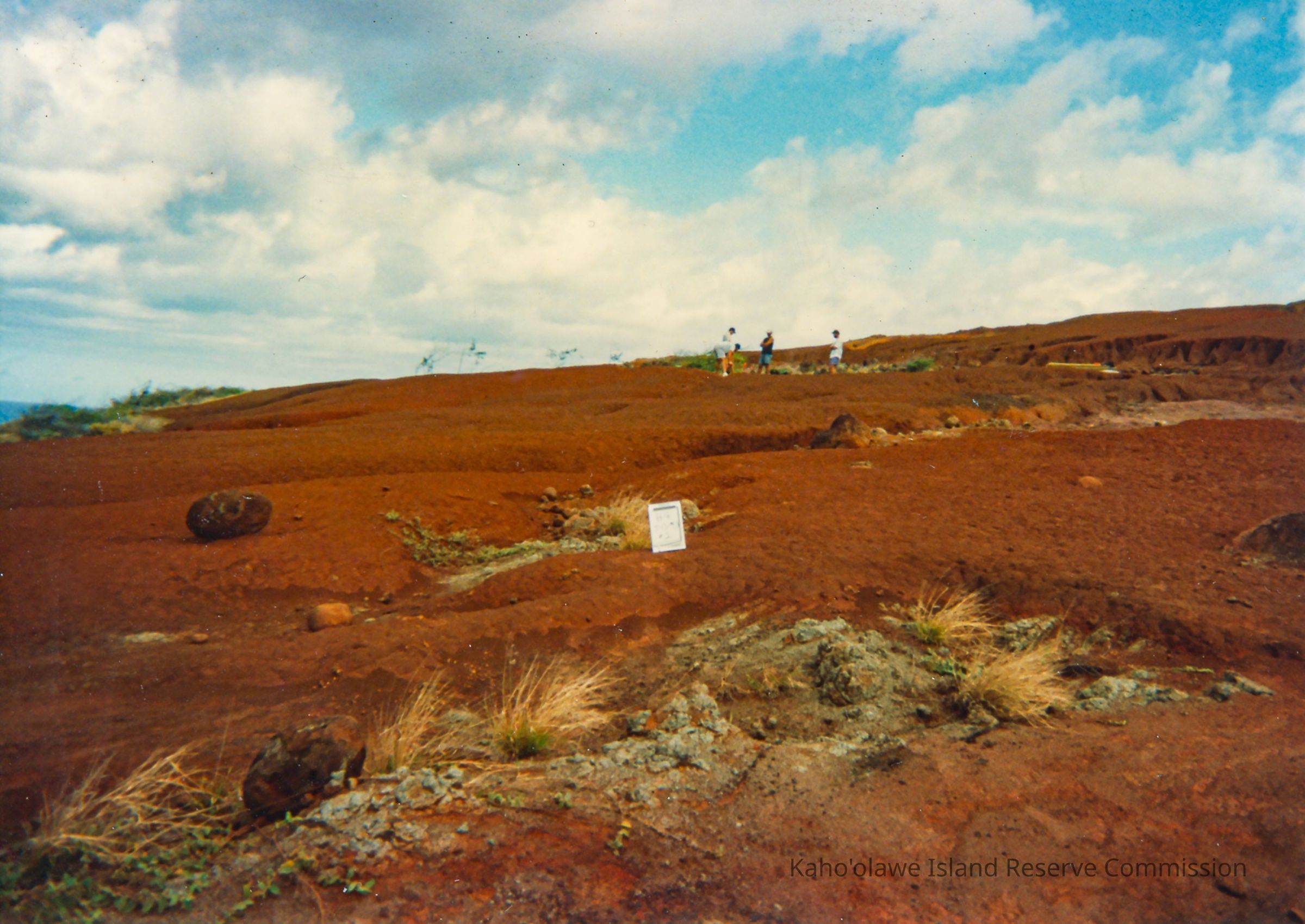 The image displays a rugged, red-brown landscape with sparse vegetation and a few people standing in the distance under a cloudy sky.