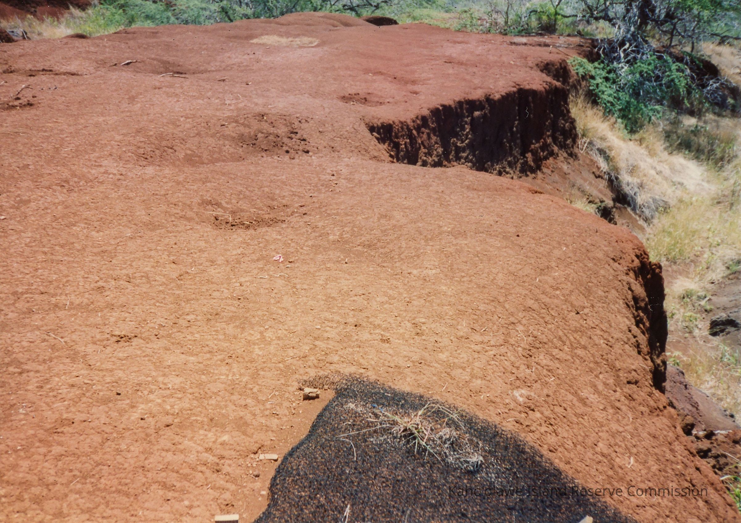 The image showcases a rugged terrain with rich red earth and deep erosion-formed cliffs under a bright sky, surrounded by sparse greenery.
