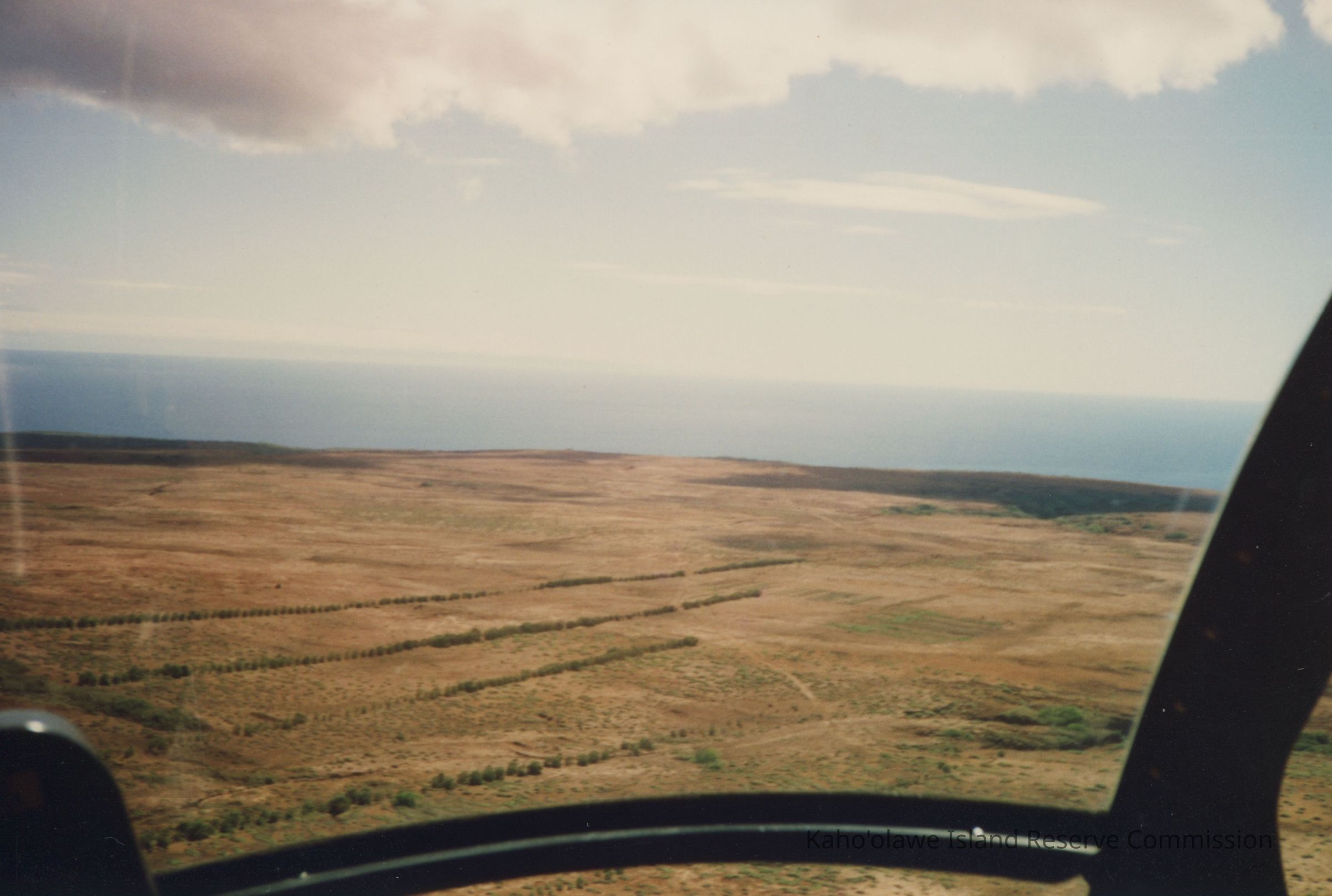 In the image, a helicopter view captures an expansive, arid landscape with scattered vegetation, set against a distant, calm ocean horizon, under a partly cloudy sky.