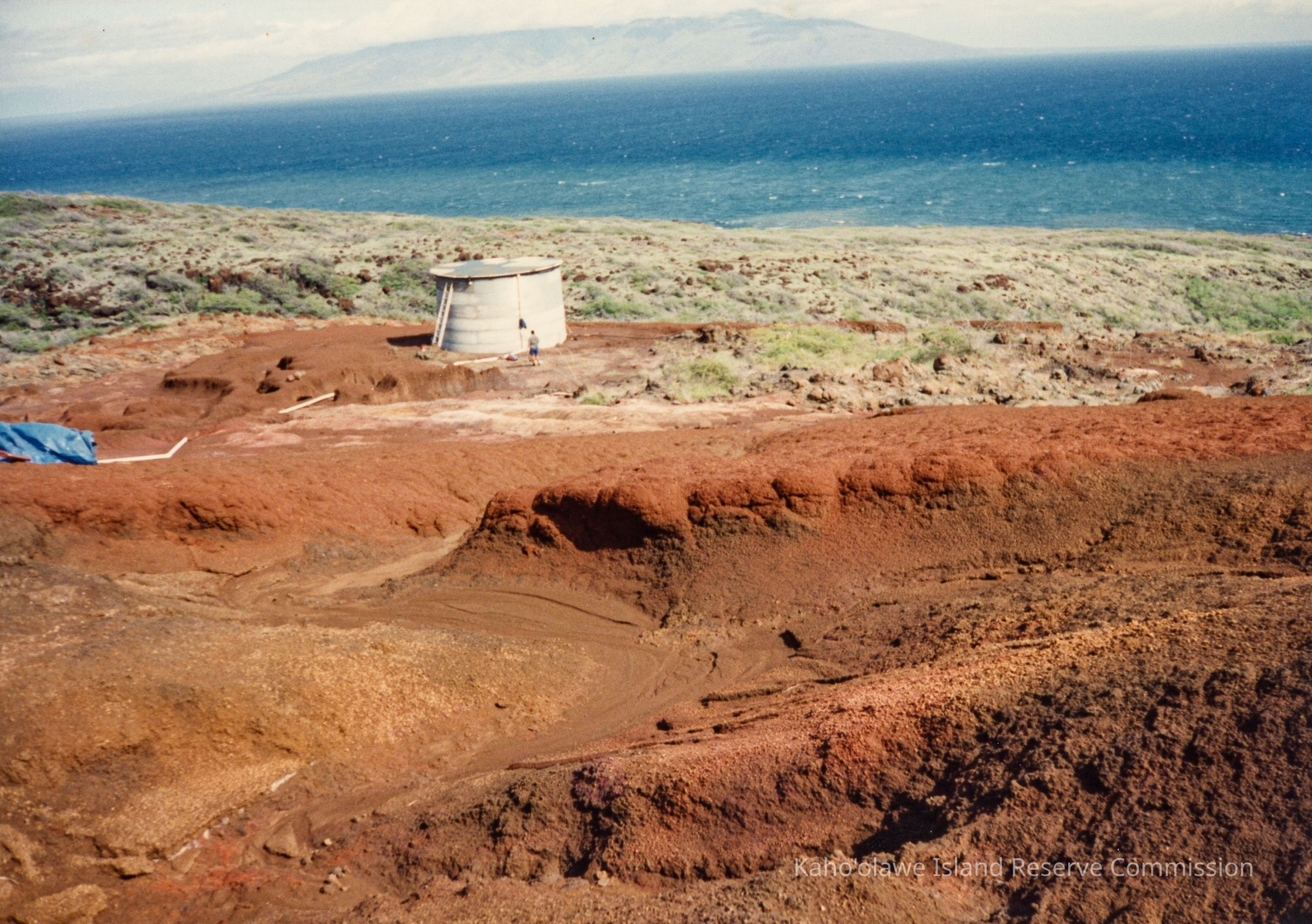 Color photograph of uneven hardpan terrain with metal water tank in the background with unidentified people working around it. White-capped ocean and Maui in the far background.