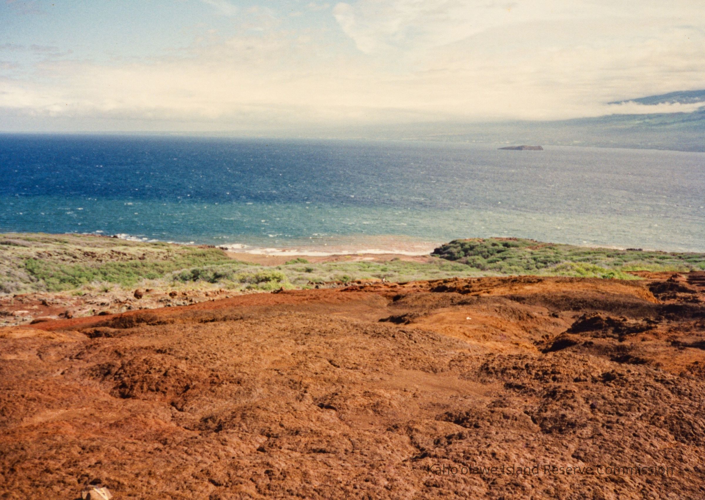 Color photograph of uneven hardpan terrain with a beach, ocean, Molokini and part of Maui in the far background.