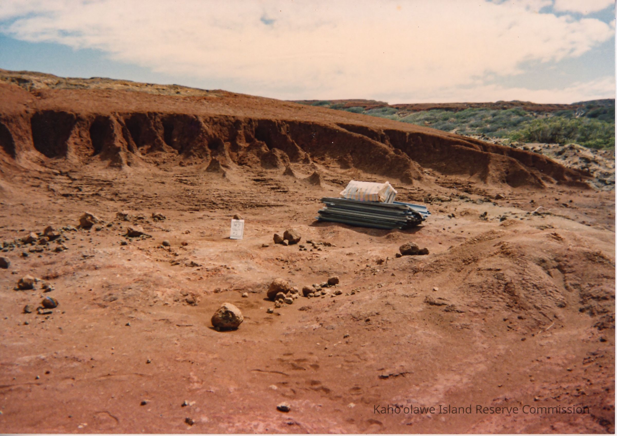 This image shows stacks of unused building materials in a barren, reddish landscape. Trees are in the far background.
