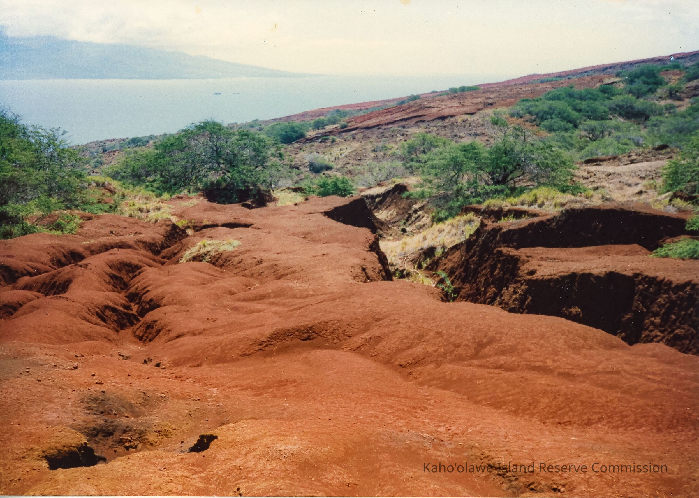 Color photo of hardpan terrain with a small gully to the right. The ocean and the island of Maui are in the background.