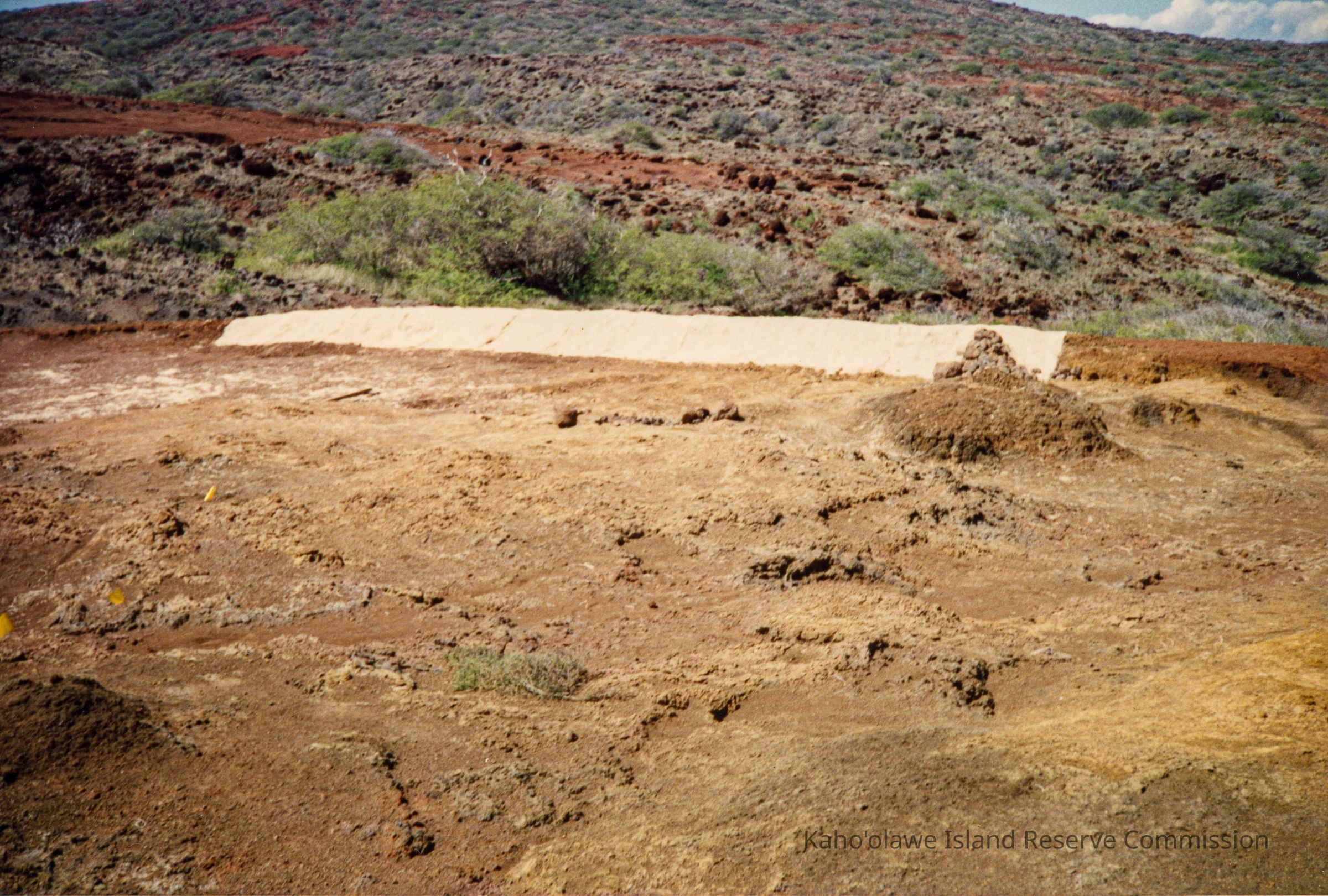 Color photograph of hardpan terrain with a part of it covered with unidentified material taken from a distance. This photograph may have been taken in the Lua ‘O Keālialuna area.
