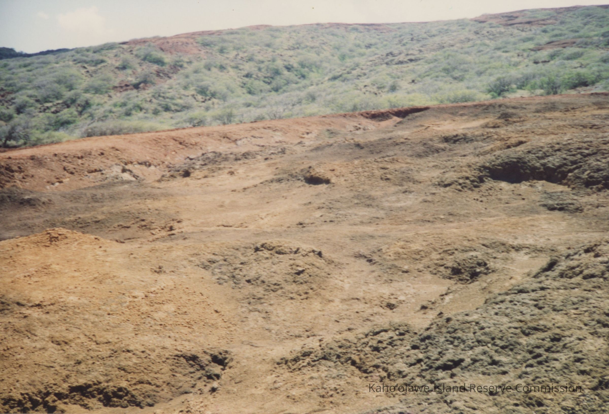 Color photograph of hardpan terrain with boulders, hillsides, the ocean and part of the island of Maui in the background.Photograph Details