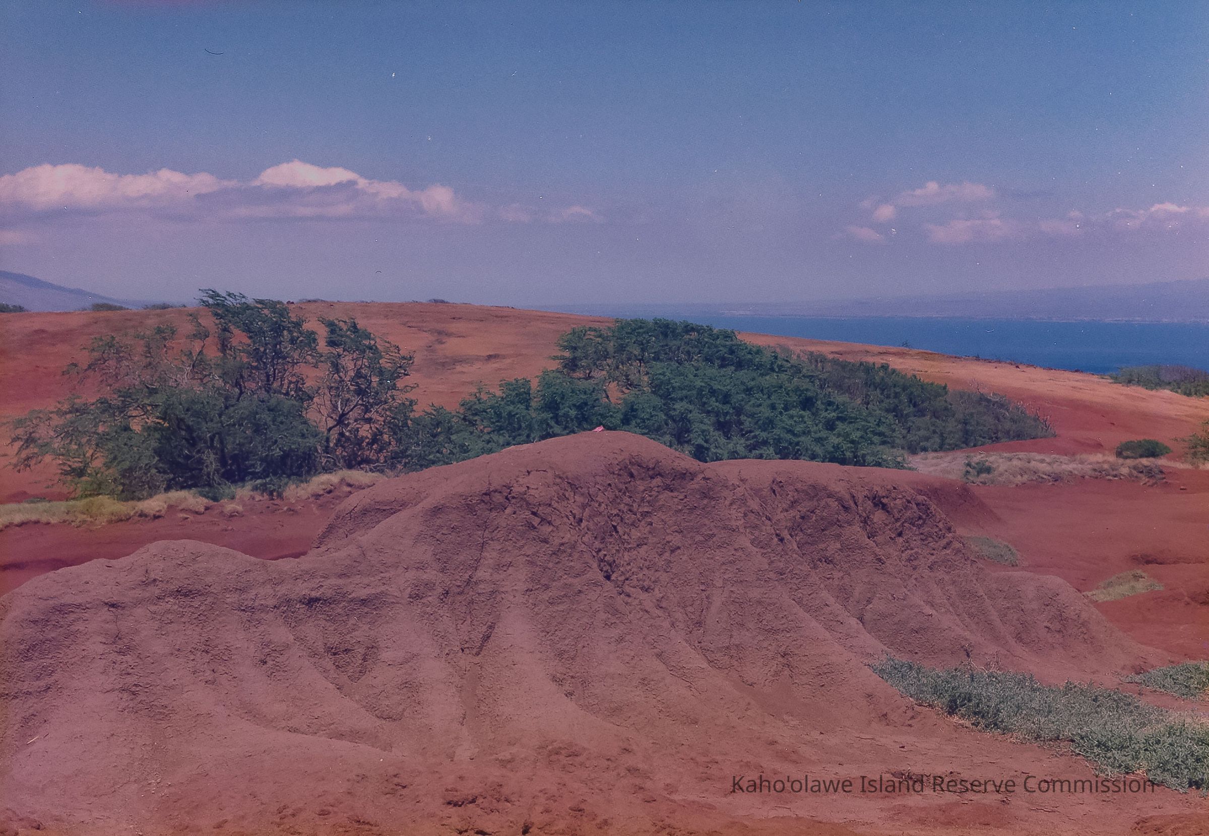Color photo a profile view of a hardpan ridge with trees, ocean and Maui in the background.