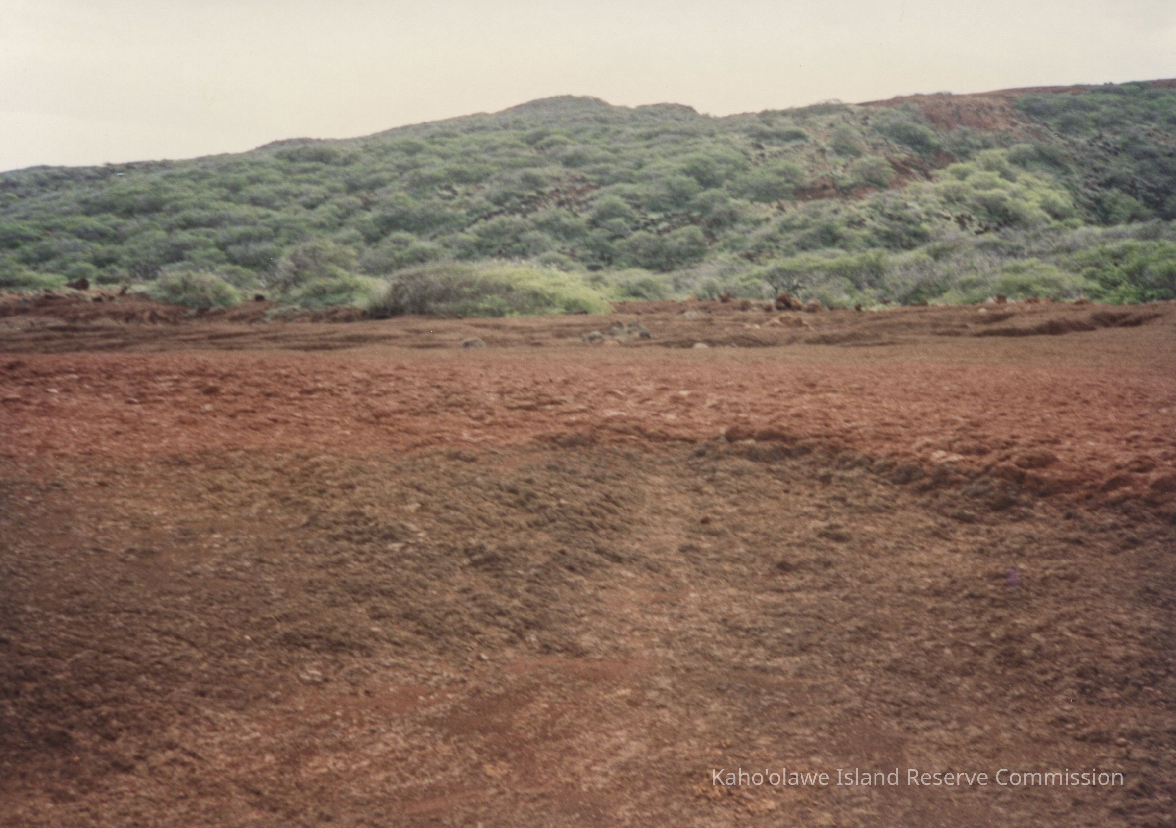 The image shows a reddish-brown hardpan terrain with green hills in the background.