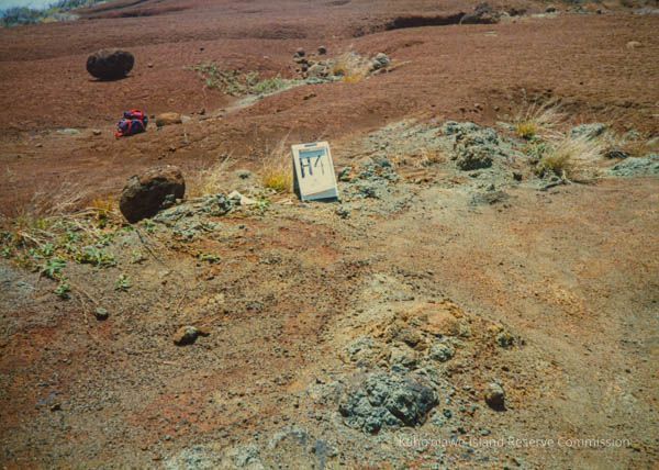 Color photo of hardpan terrain (possibly an archaeological site or burn site) with a white sign labeled "H4." There is red and blue sack next to a small pōhaku in the background.