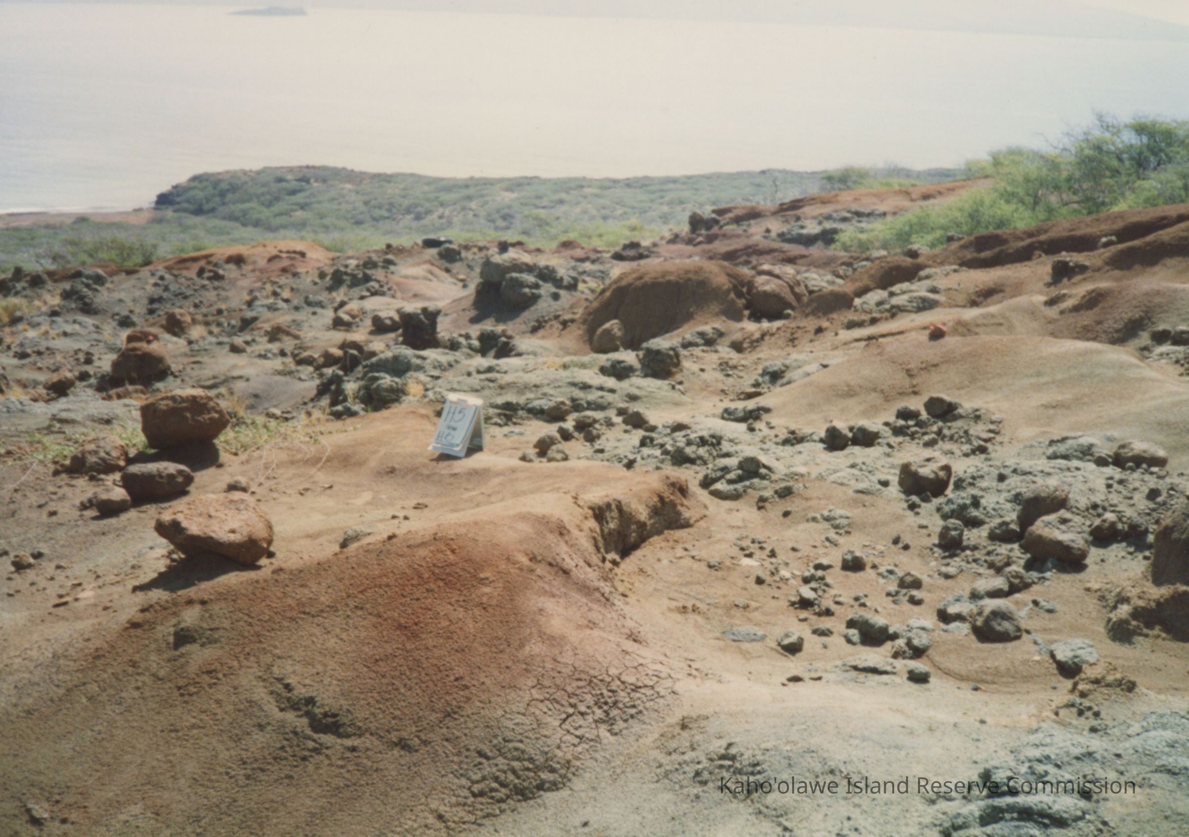 Color photo of rolling hardpan terrain with a white sign labeled "H5" indicating either an archaeological site or a burn site. The ocean is in the far background.