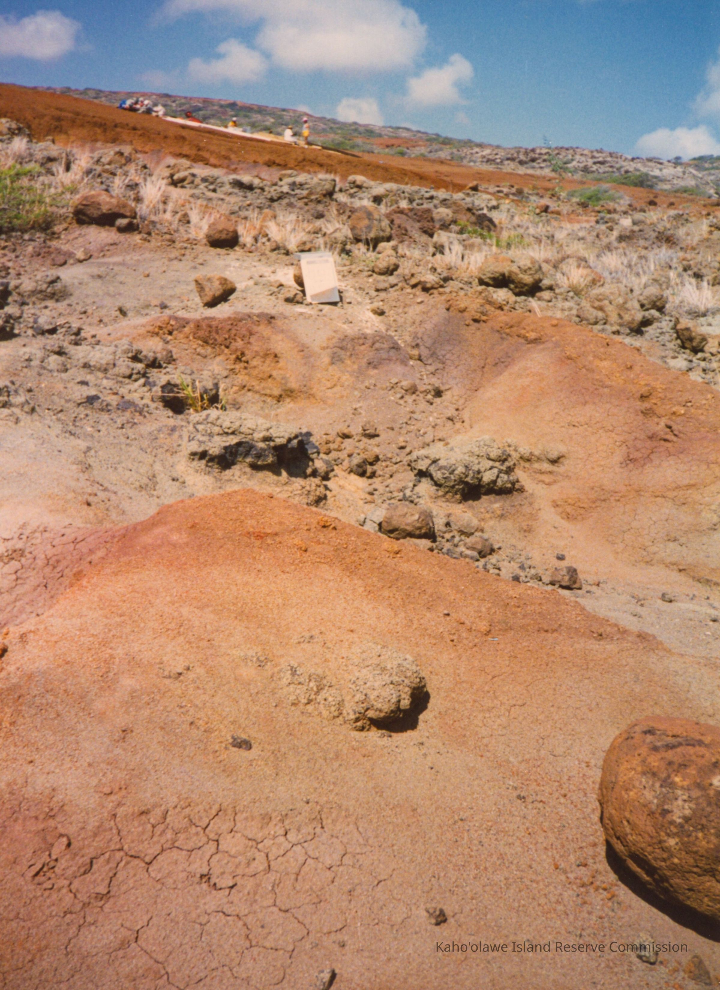 Color photo of a hilly hardpan area with a white sign in the back, indicating a possible burn area. There are a group of people sitting and standing in the far background.