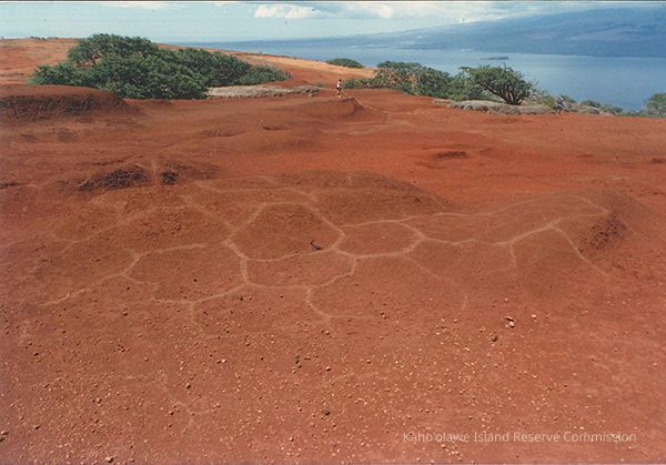 Color photo of unusual patterns in hard pan with Molokini and Maui in the background.