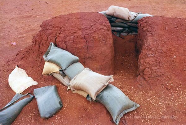 Color photo of a group of filled sacks on hard pan, possibly near at a soil pipe.