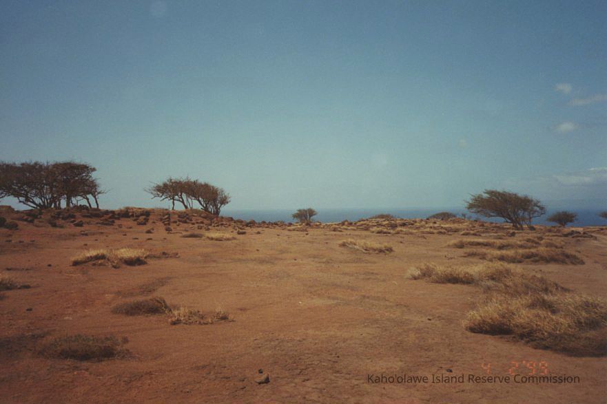 The image displays a sparse, arid landscape with scattered trees and dry brush under a clear blue sky near a visible coastline.