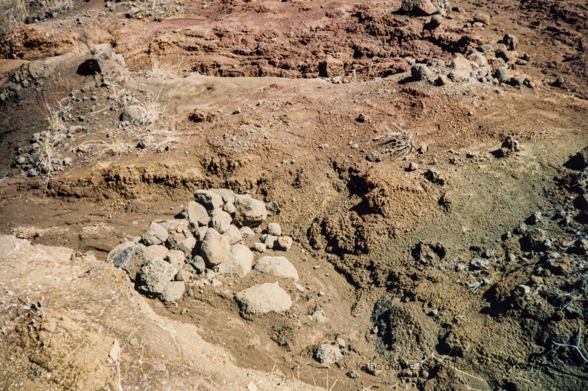 The image shows a dry, rocky landscape containing loose stones and sparse vegetation, depicting the start of a check dam for water conservation.
