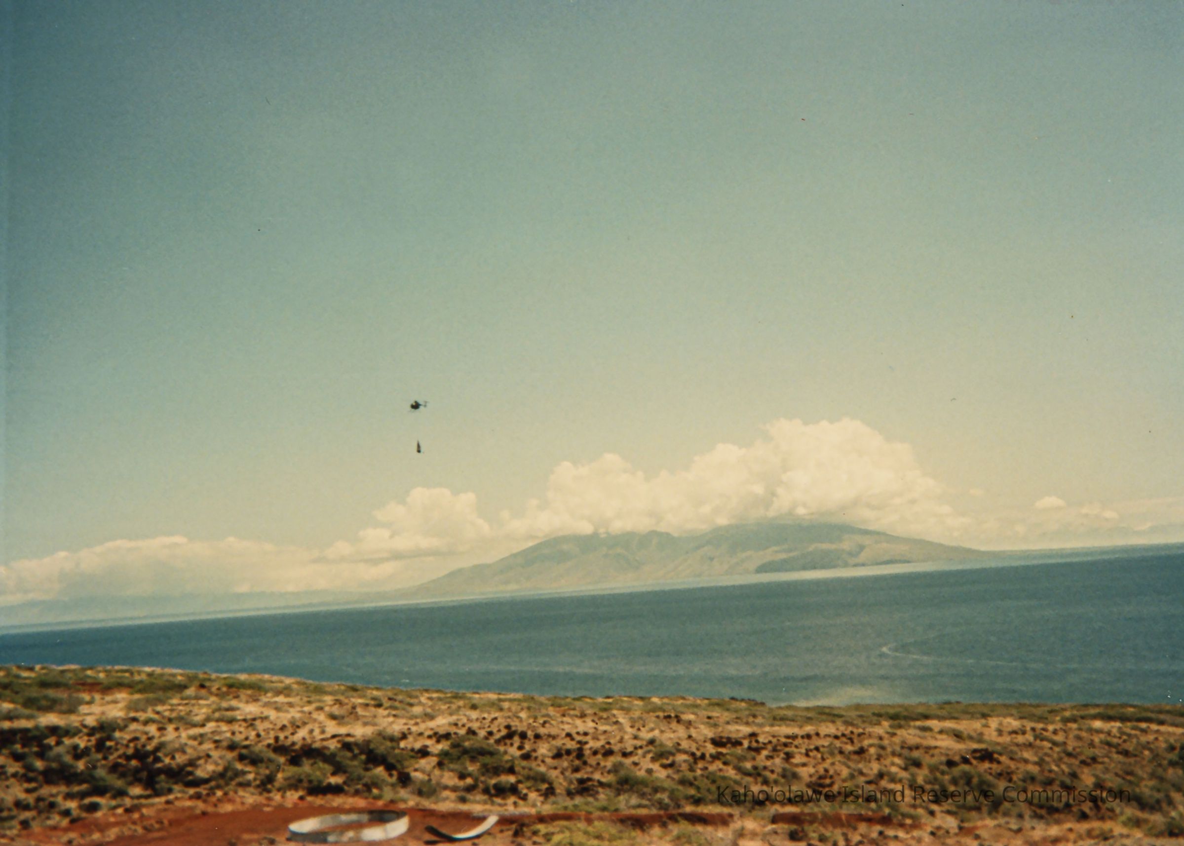 Color photo of a helicopter flying from a distance transporting a cargo net towards Kaho'olawe. There is a partially constructed water catchment structure in the foreground. This photo may have been taken at Wailuna in Hakioawa 'Ili.