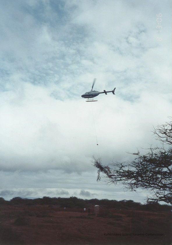 A photo of a flying helicopter hauling a brush pile with a long line.