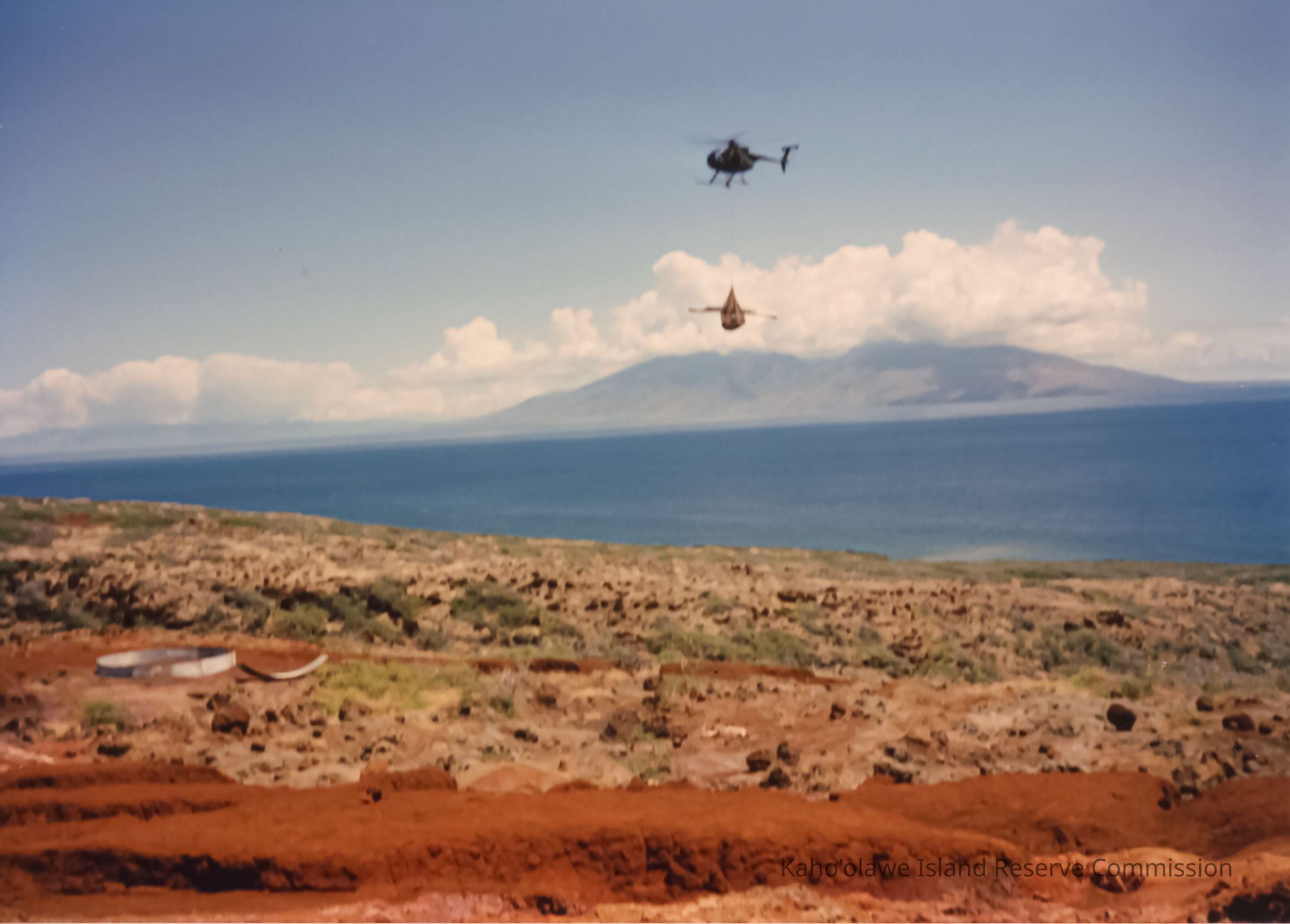 Color photo of a helicopter flying construction materials in a cargo net to Kaho'olawe from Maui. An unfinished metal water catchment is in the lower left hand corner of the photo. This photograph was probably taken in Hakioawa 'Ili.