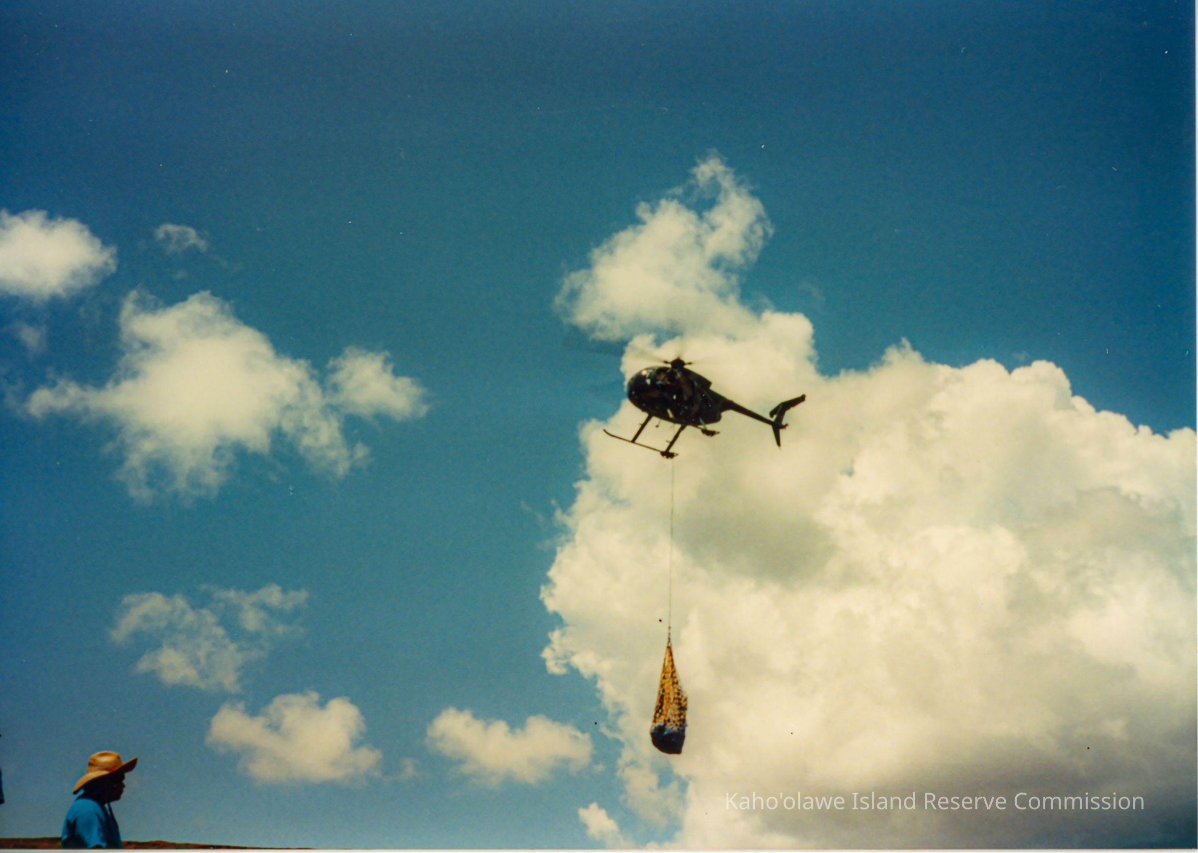 Color photo of a flying helicopter with a cargo net. Two unidentified people in the lower left hand corner. The phot was probably taken at Wailuna in Hakioawa 'Ili.