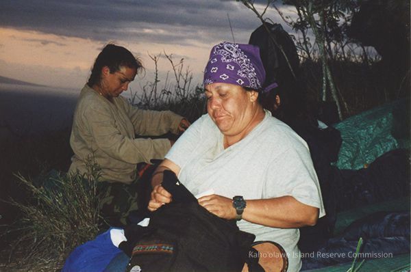 Color photo of Hokulani Holt packing with an unidentified woman behind her in an unidentified area. They may be camping.Collection