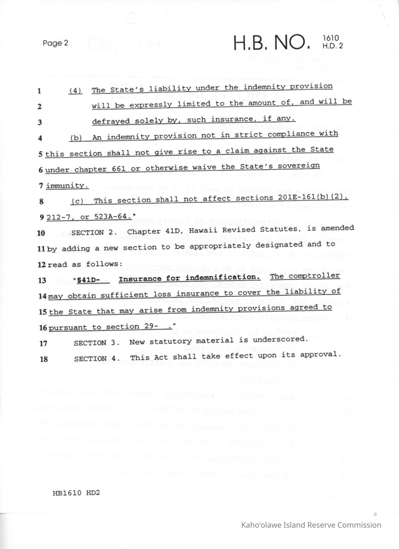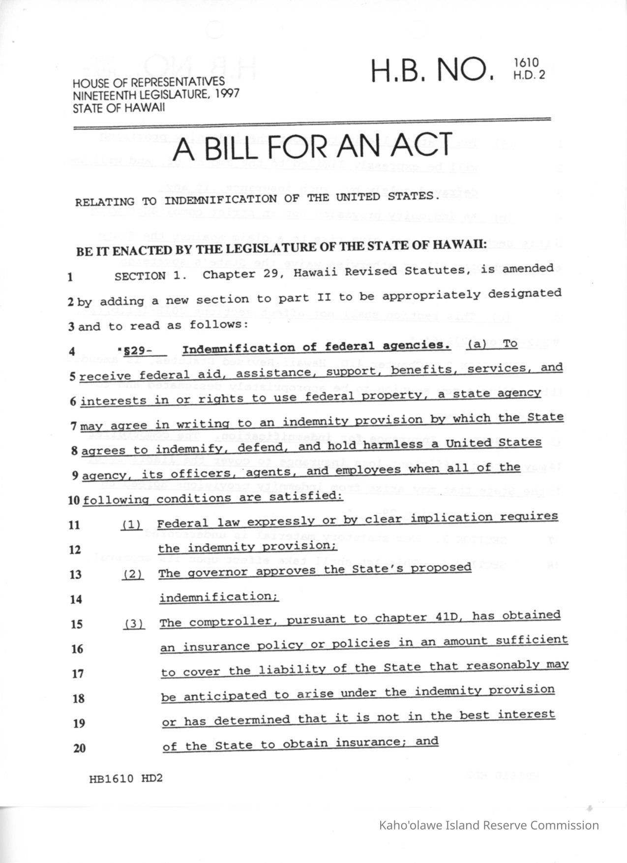 House Bill No. 1610 House Draft 2, A Bill for An Act Relating to Indemnification of the United StatesEntry/Object ID