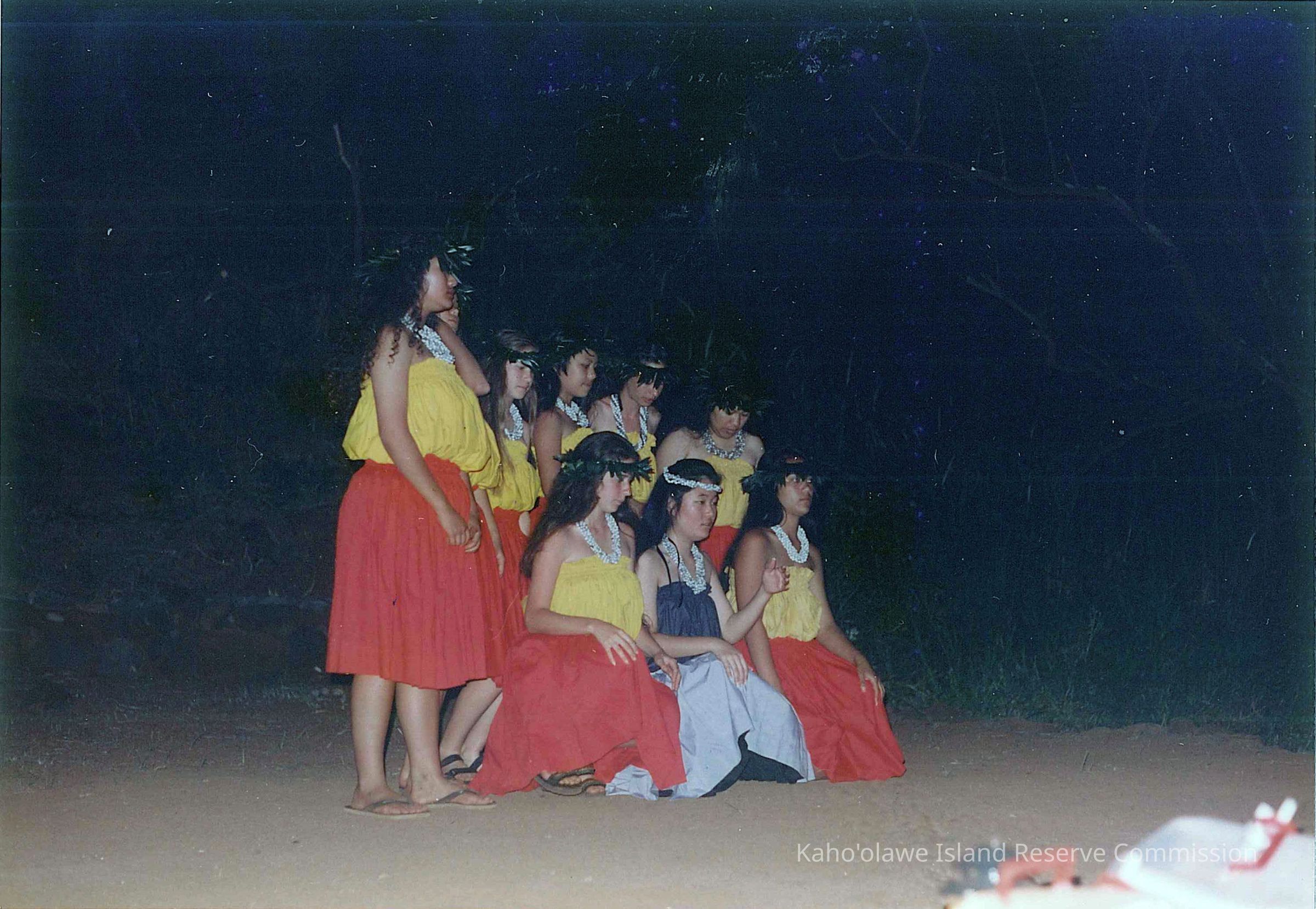 The image captures a group of individuals, dressed in traditional outfits with lei (garland) and lei po'o (head garland), some standing and some kneeling.