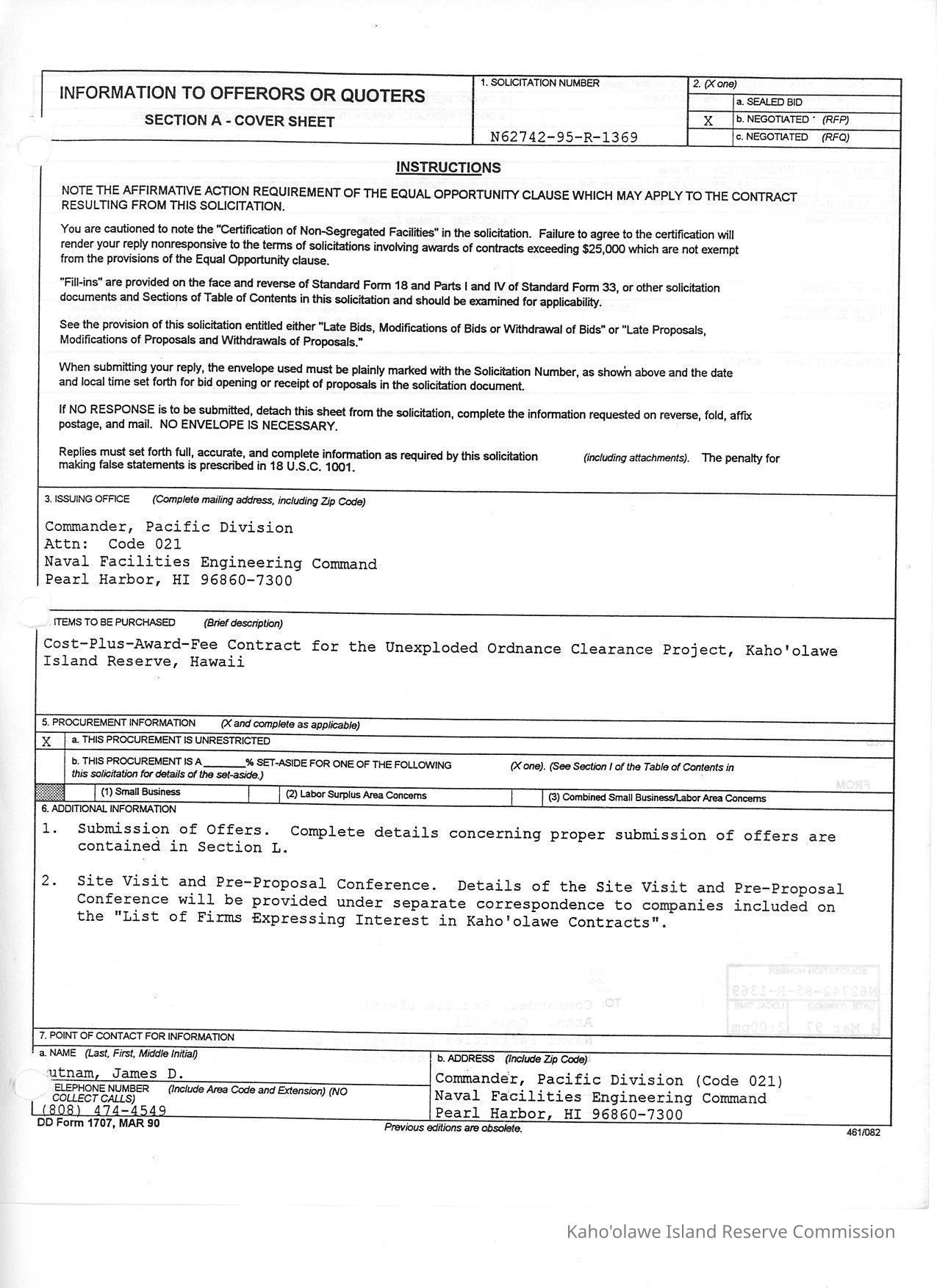 Information to Offerors or Quoters for the Cost-Plus-Award-Fee Contract for the Unexploded Ordnance Clearance Project, Kahoolawe Island Reserve, Hawaii. Also contains glossary and documents regarding PACDIV Organization. Information to Offerors or Quoters for the Cost-Plus-Award-Fee Contract for the Unexploded Ordnance Clearance Project, Kahoolawe Island Reserve, Hawaii. Contains: Coversheet (Sec A); [Part 1 -The Schedule] Solicitation, Offer and Award Form, Supplies or Services and Prices/Costs (Sec B), Description/Specs/Work Statement (Sec C), Packaging and Marking (Sec D), Inspection and Acceptance (Sec E), Deliveries or Performance (Sec F), Contract Administration Data (Sec G), Special Contract Requirements (Sec H),[Part II-Contract Clauses] Contract Clauses (Sec I); [Part III List of Documents, Exhibits and Other Attach.] List of Attachments (Sec J); [Part IV Representations and Instructions] Representations, Certifications and Other Statements of Offerors (Sec K), Instrs, Conds, and Notices to Offerors (Sec L), Evaluation Factors for Award (sec M)Collection