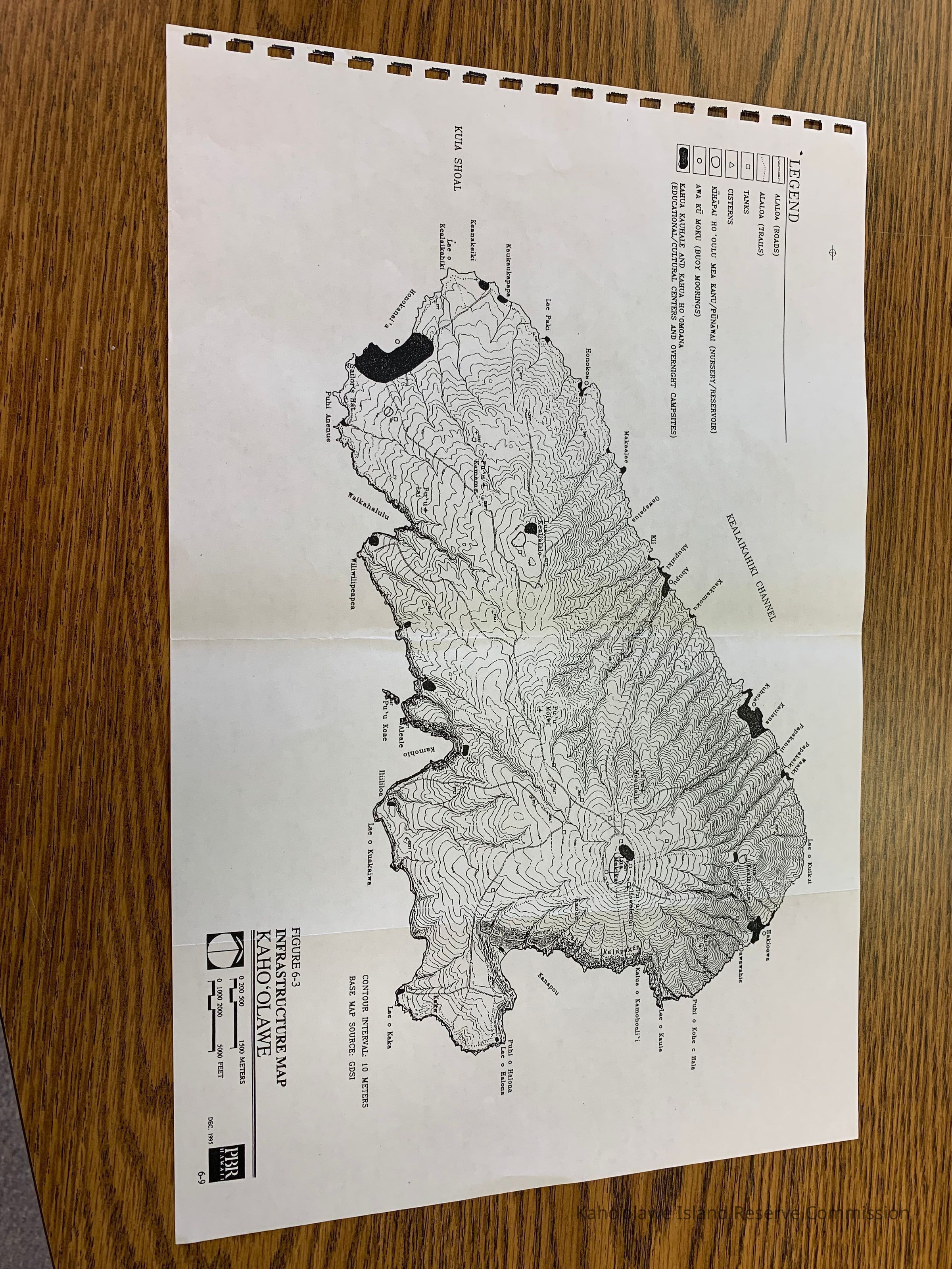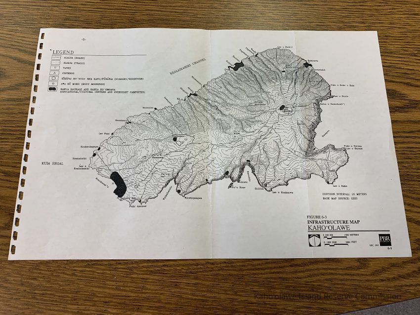 Map of the infrastructure on Kahoolawe. Labeled Figure 6-3 of unknown publication. Shows alaloa (roads and trails), tanks, cisterns, kihapai hooulu mea kanu/punawai (nursery/reservoir), awa ku moku (buoy moorings), kahu kauhale and kahua hoomoana (educational/cultural centers and overnight campsites).Collection