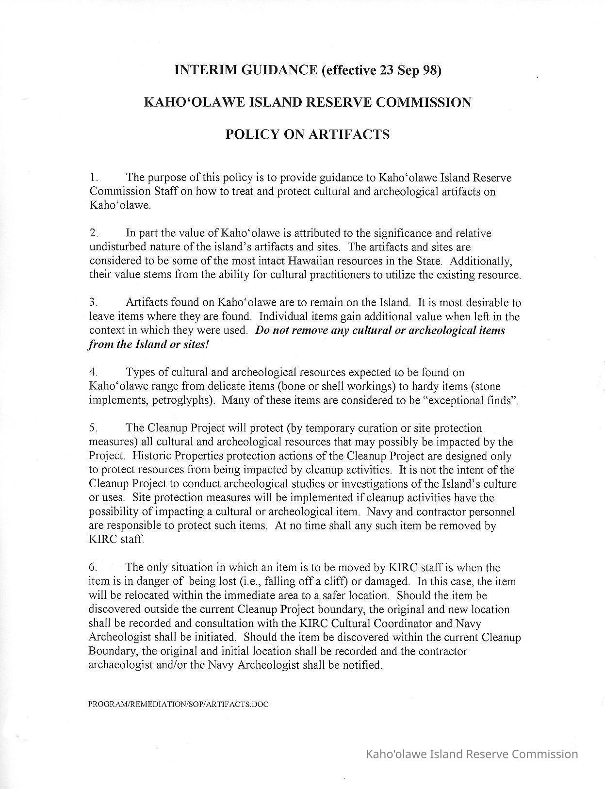 Interim Guidance, Kaho'olawe Island Reserve Commission, Policy on ArtifactsDescription