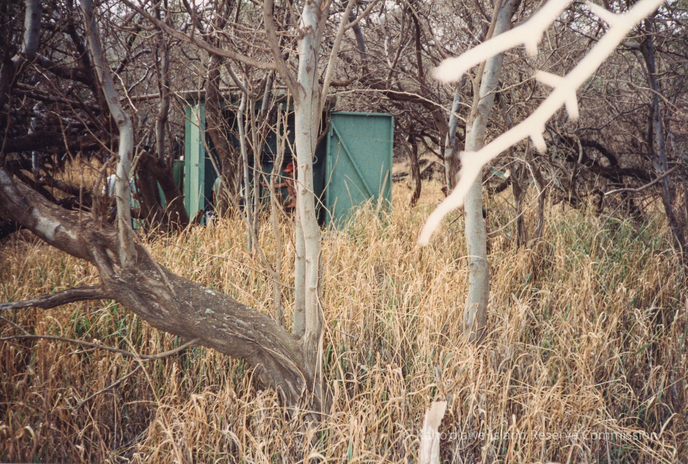 In a thicket of dry grass and leafless trees stands an inconspicuous green metal shed, partially concealed by the surrounding branches.