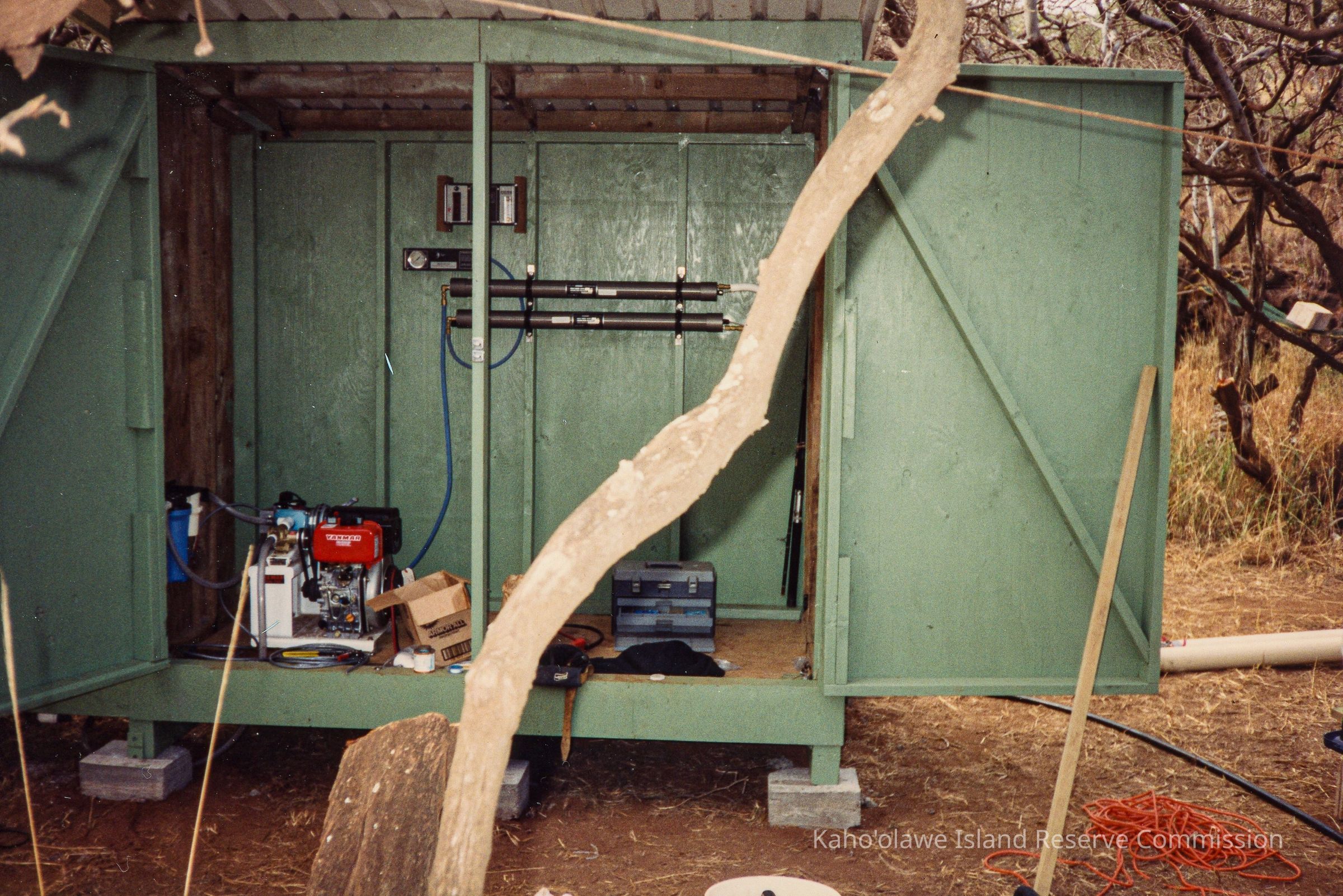 Color photo of an irrigation shed with opened doors with a tree in front of it. The photograph may have been taken in Hakioawa, Kaho'olawe.